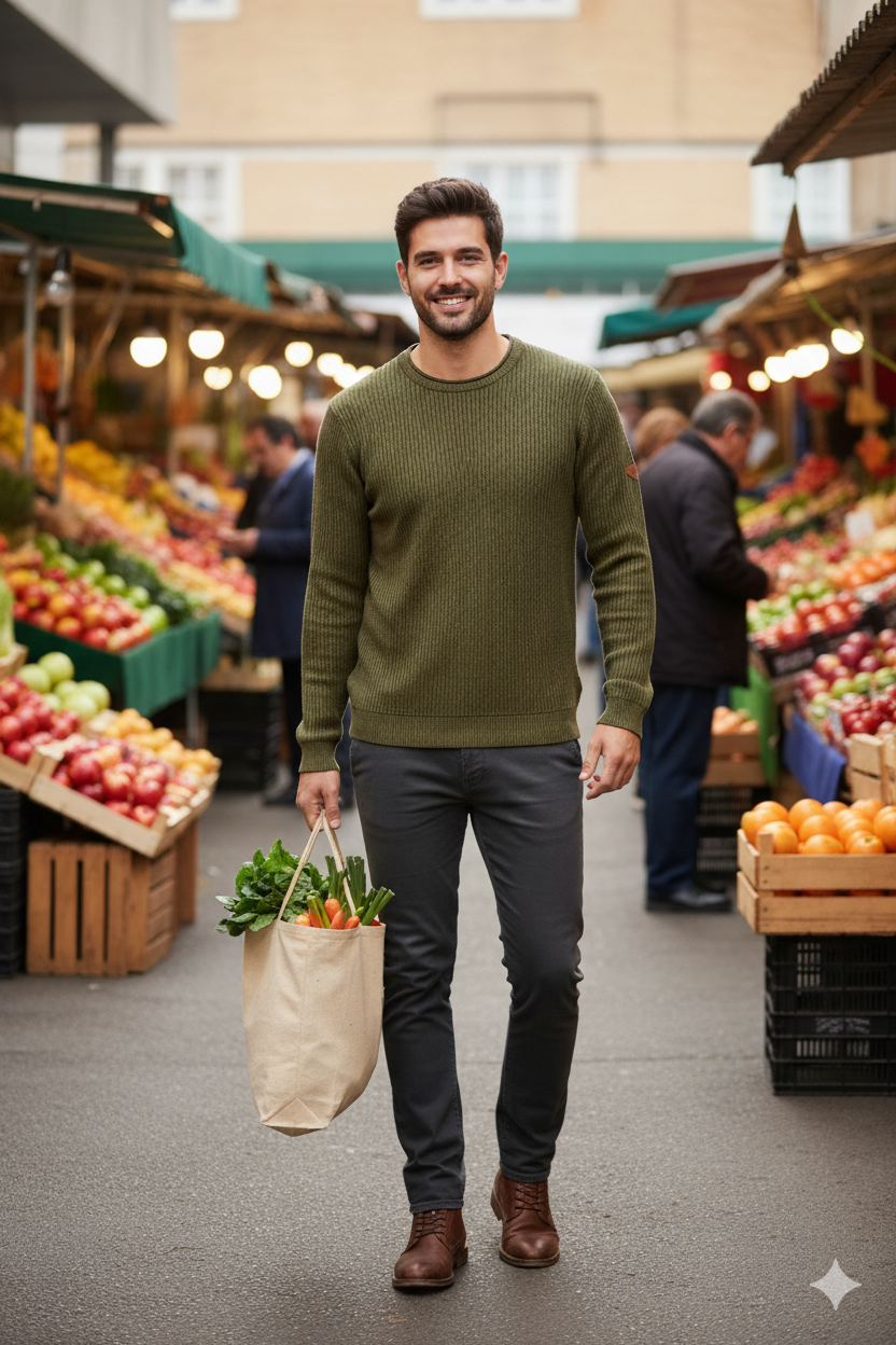 Aprovecha uno de los mejores precios de la temporada: este jersey de punto 100% algodón, cómodo, suave y con un diseño moderno en color caqui. Perfecto para usar a diario y combinar con cualquier look.