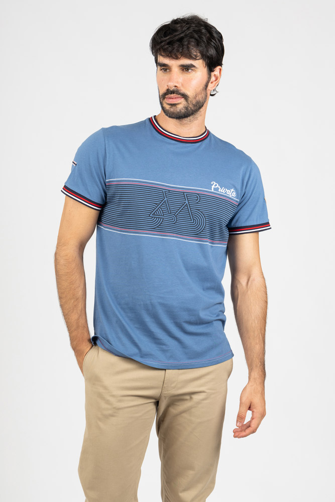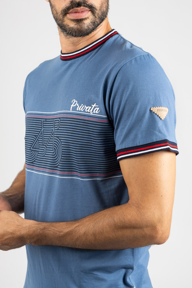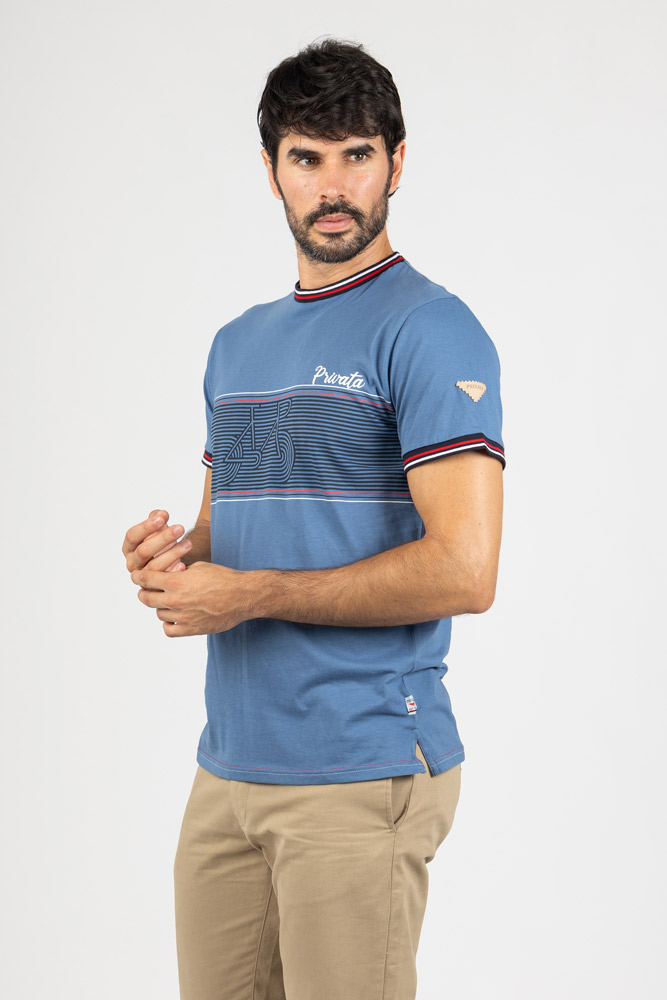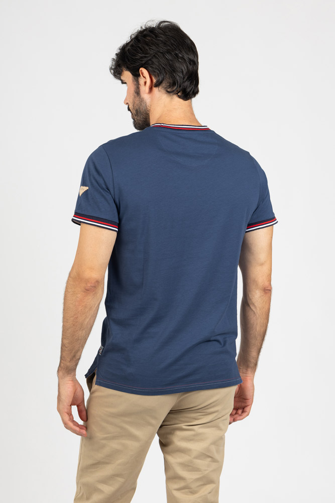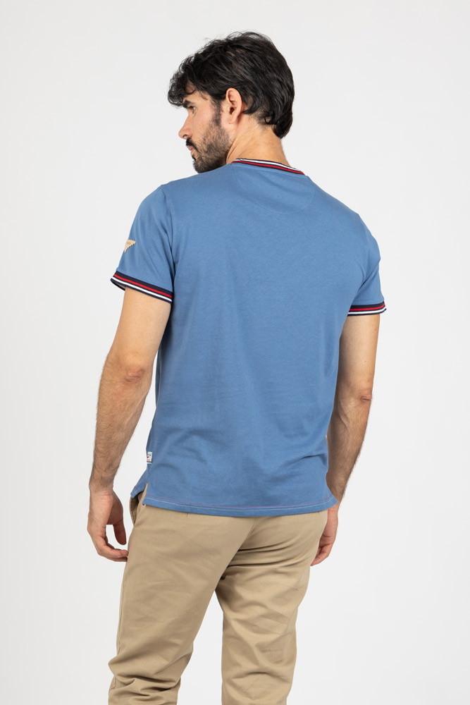 Cuello redondo con ribete en contraste en tonos rojo, blanco y azul marino, que refuerza su carácter casual. Tejido suave y ligero que garantiza confort durante todo el día.