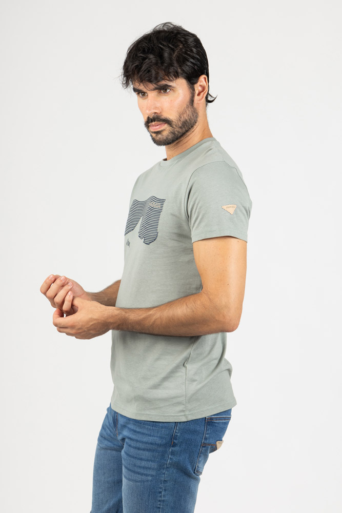 Camiseta en tono verde piedra con estampación frontal de inspiración marina, ideal para un look relajado y veraniego.