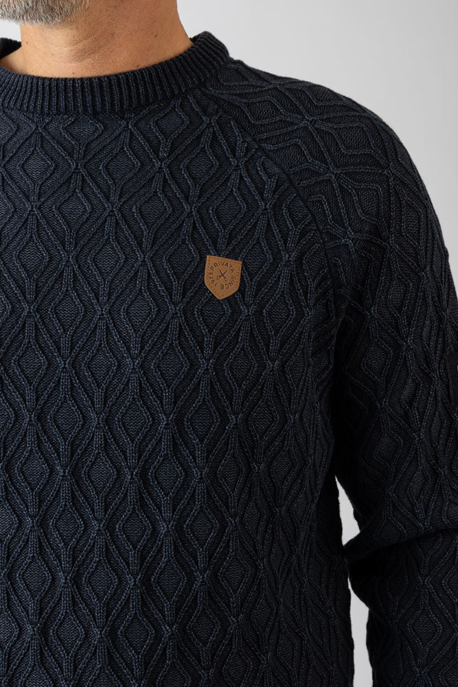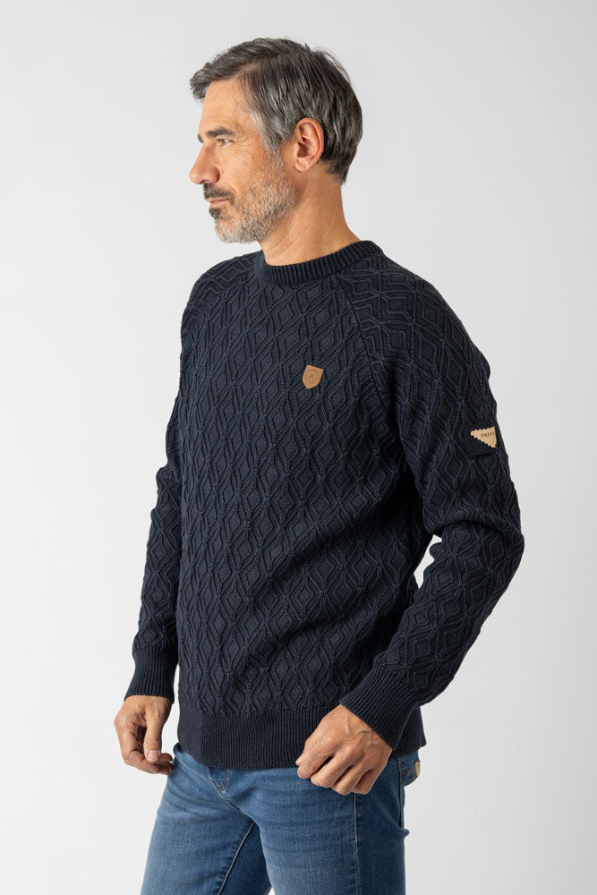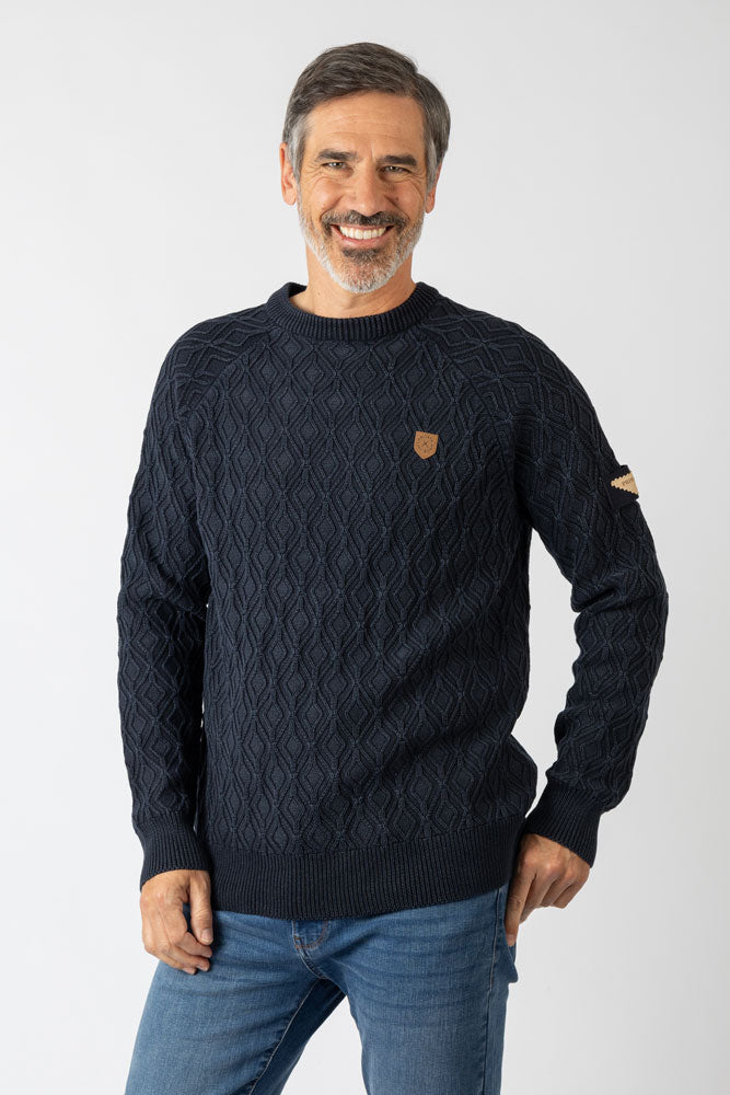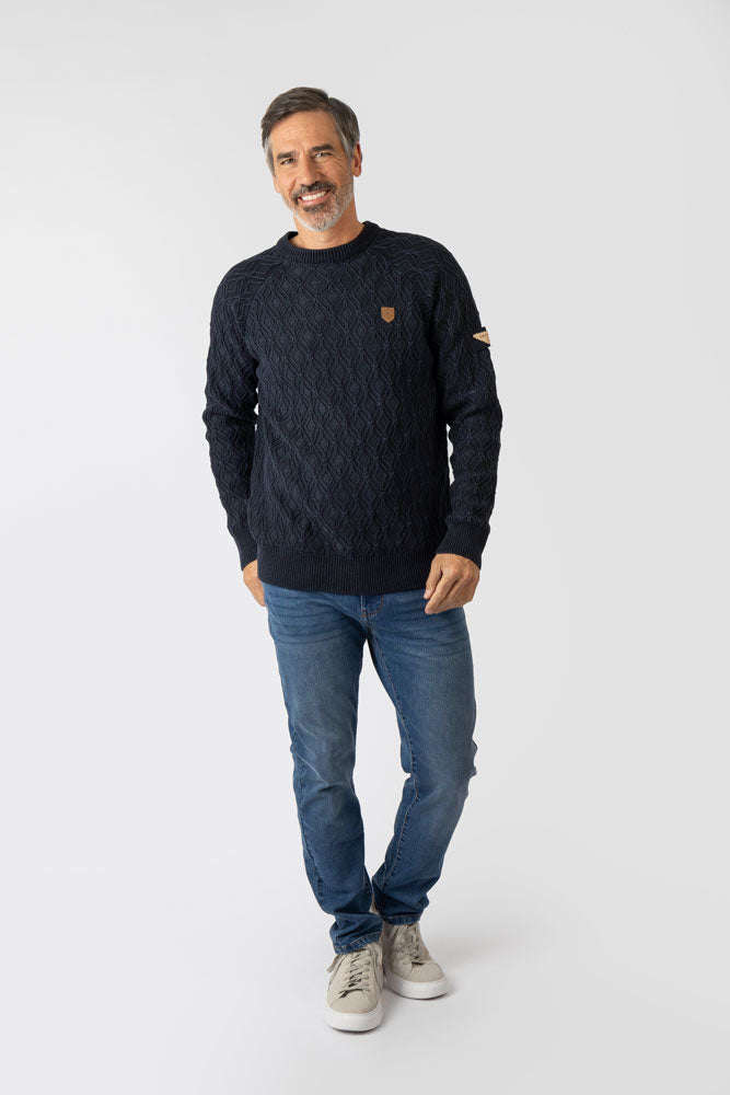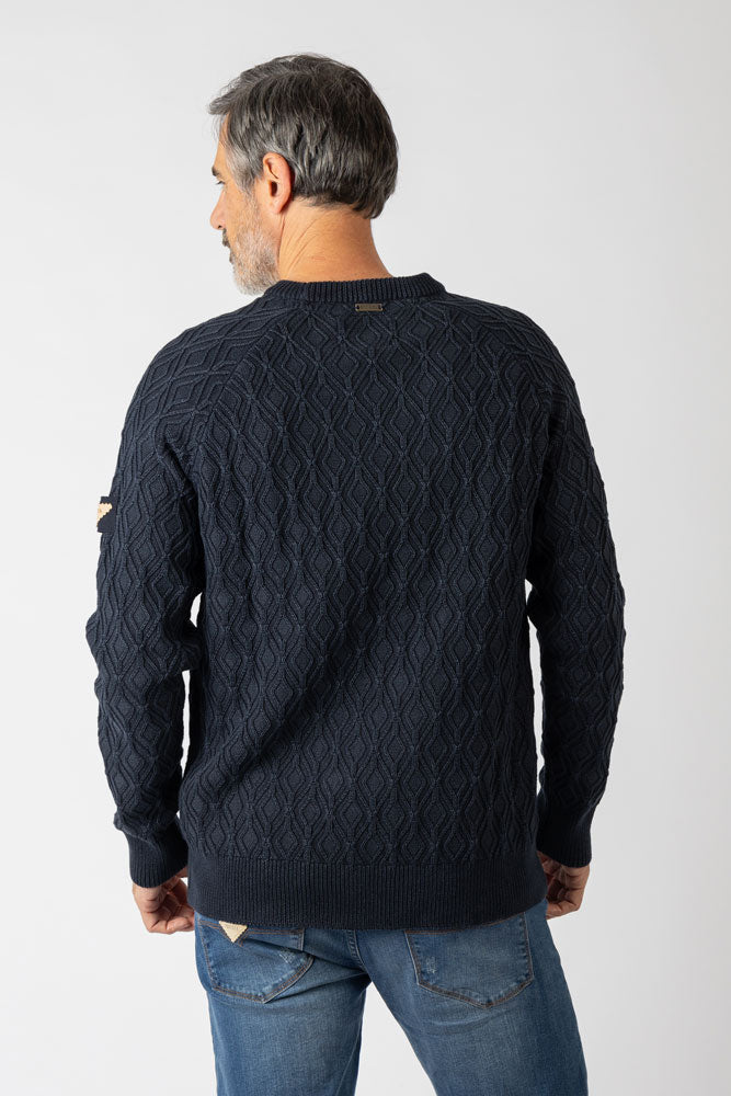 Jersey de punto cuello redondo textura. Combina muy bien con vaqueros o pantalón chino. Tejido de algodón.