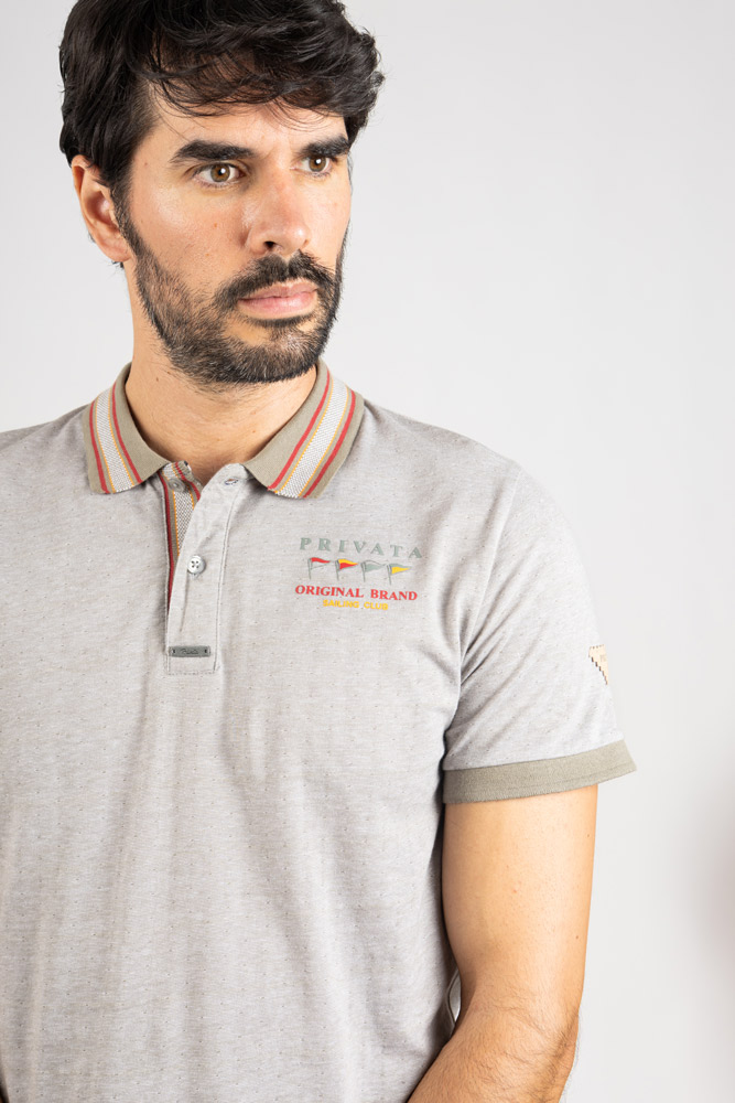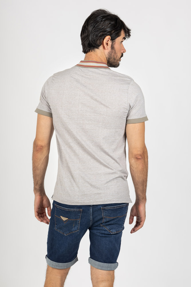 Cuello clásico con detalle de rayas en contraste y tapeta de botones. Puños ribeteados y acabados cuidados que aportan un toque distintivo.