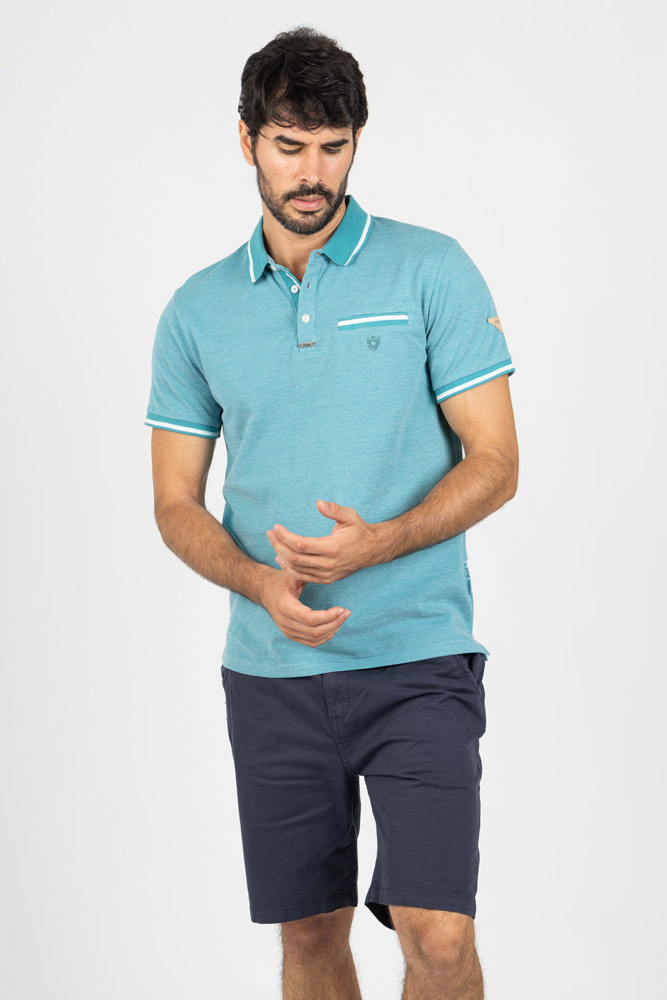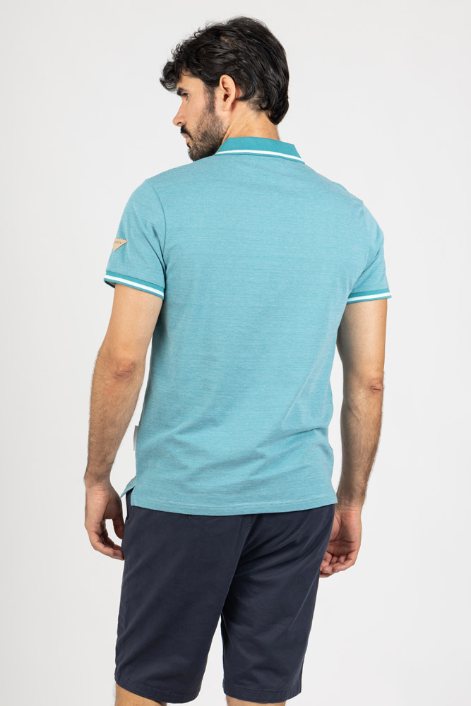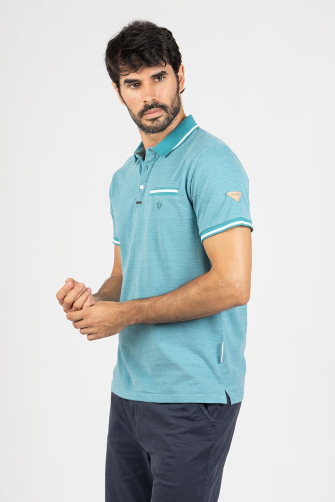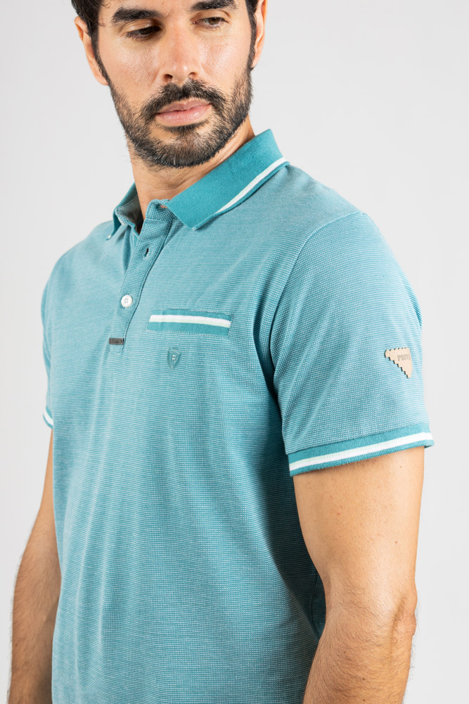 Polo en tono verde turquesa con textura de micro punto, ideal para un look moderno con un toque sofisticado.