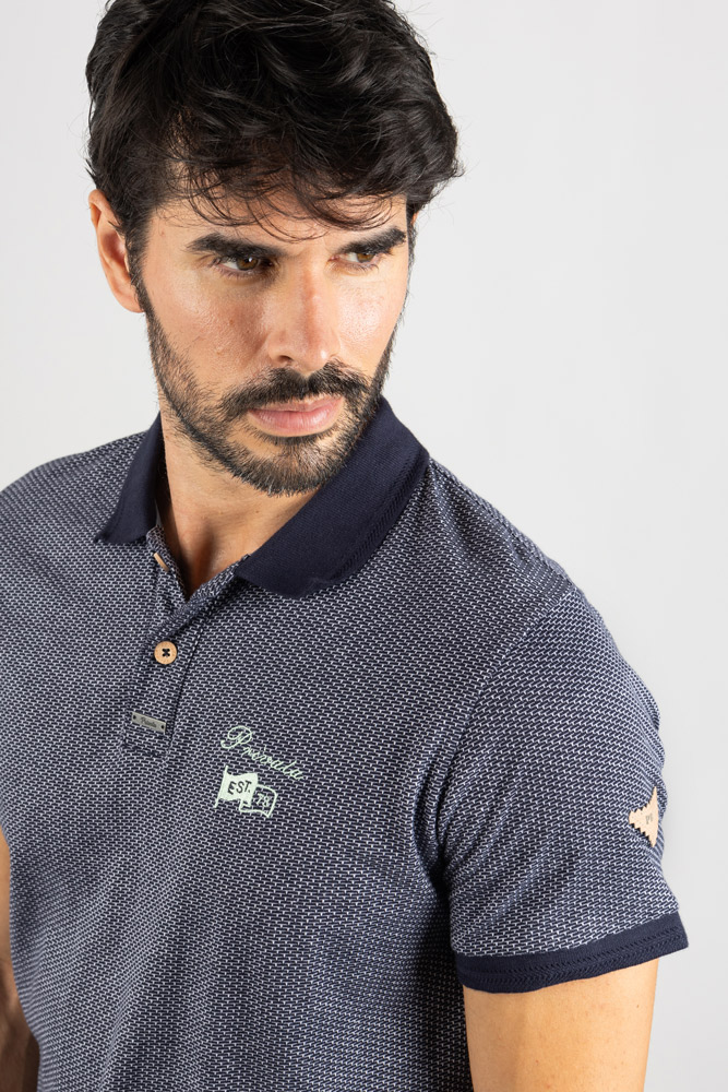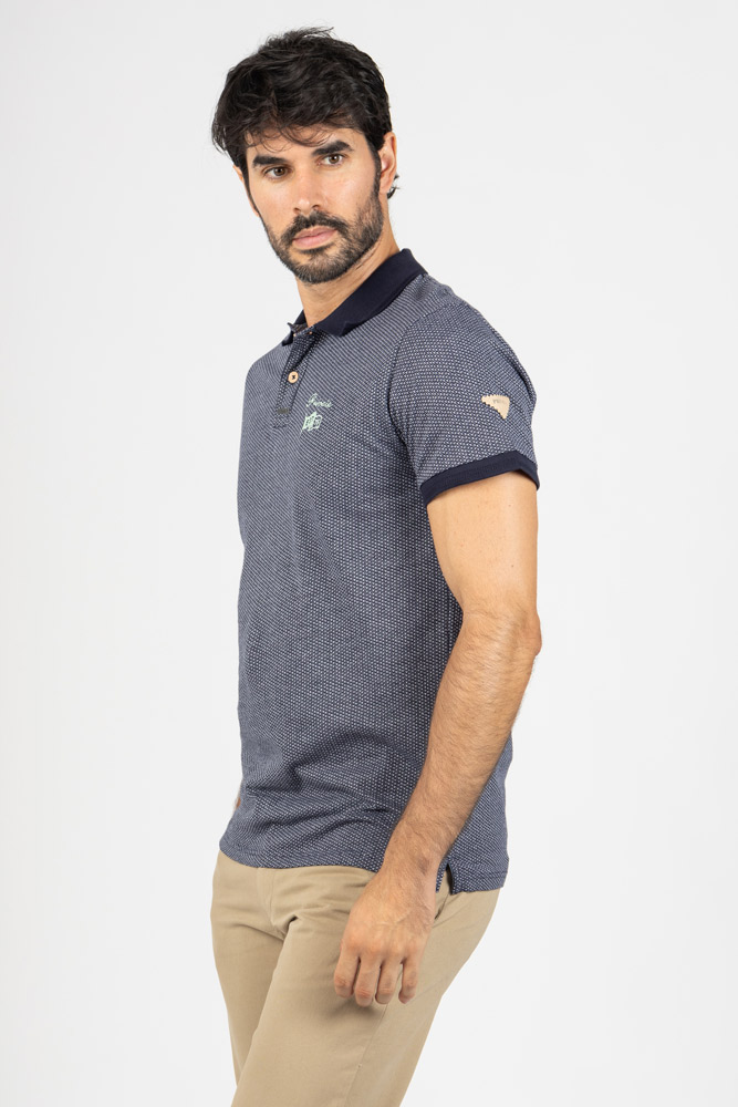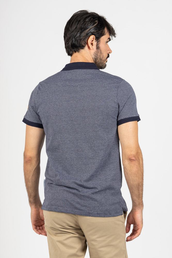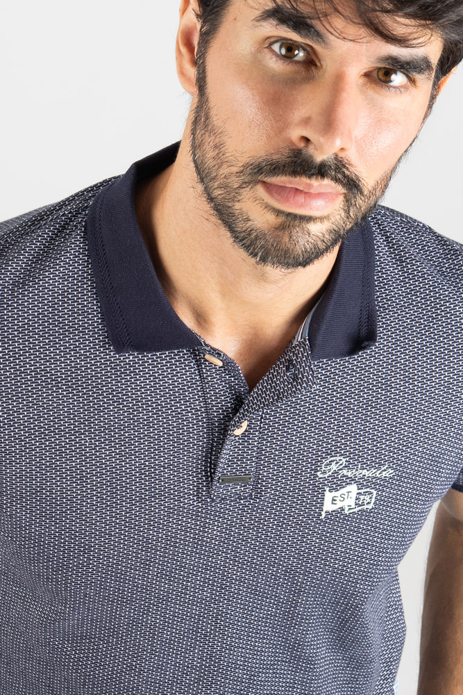 Polo en tono azul marino con micro dibujo geométrico, una propuesta elegante que aporta textura y carácter al conjunto.