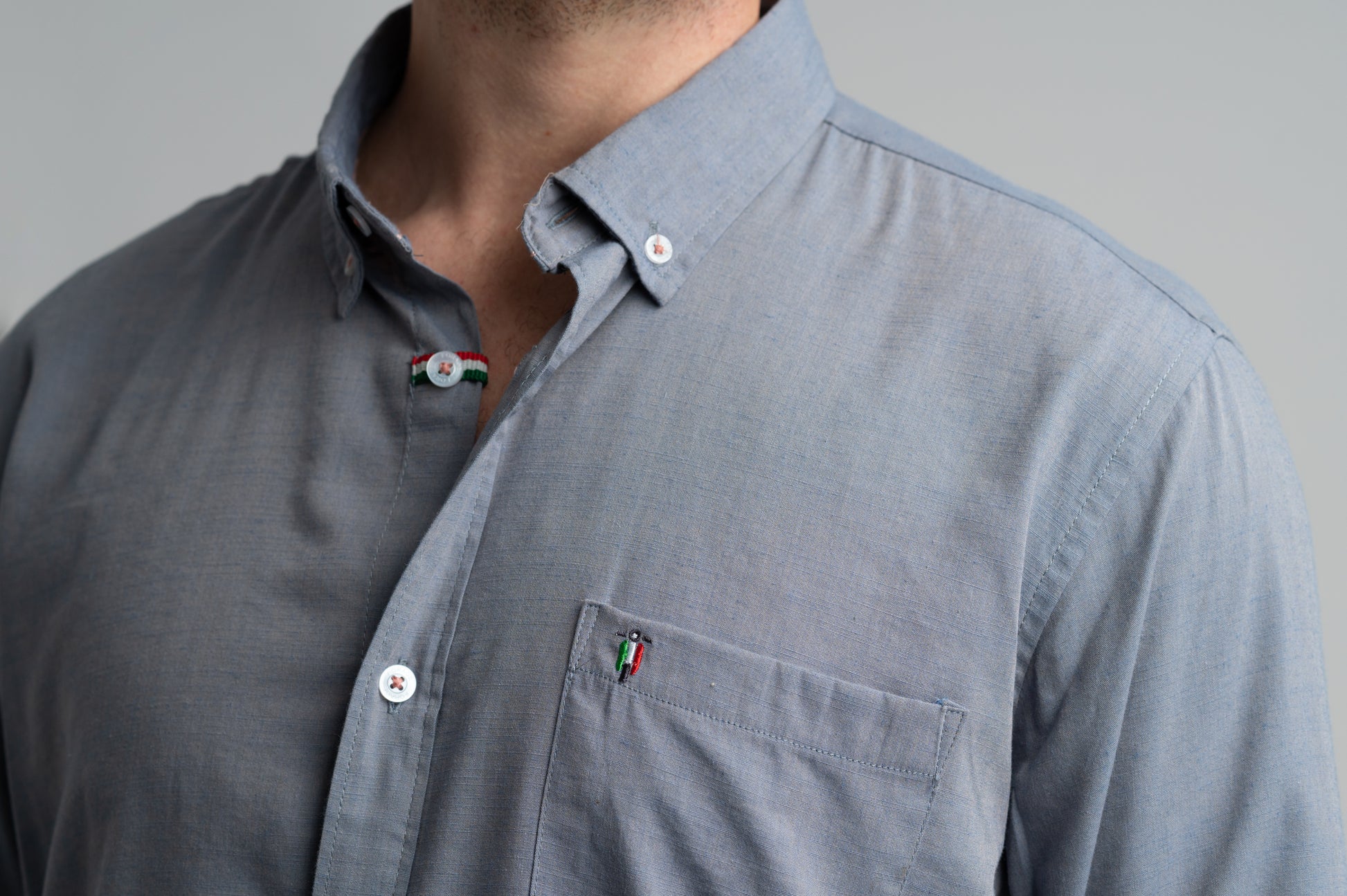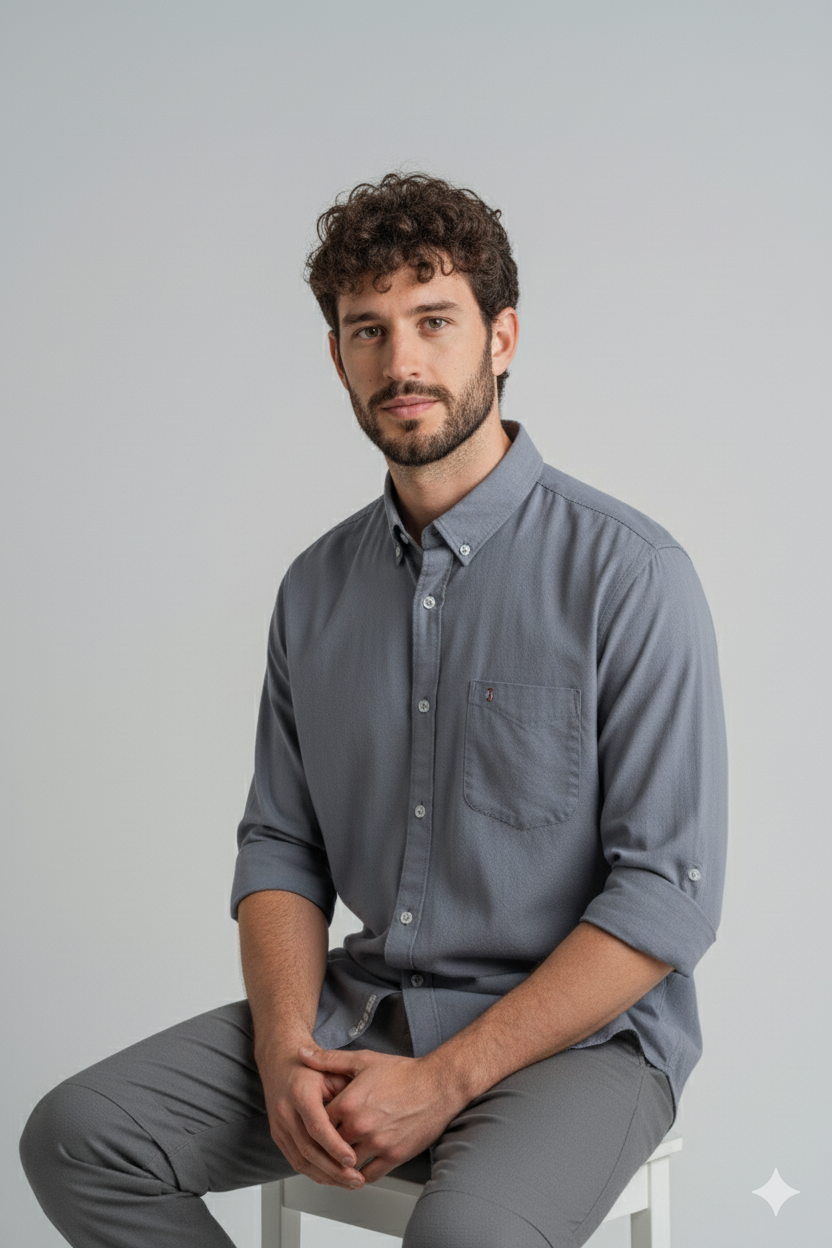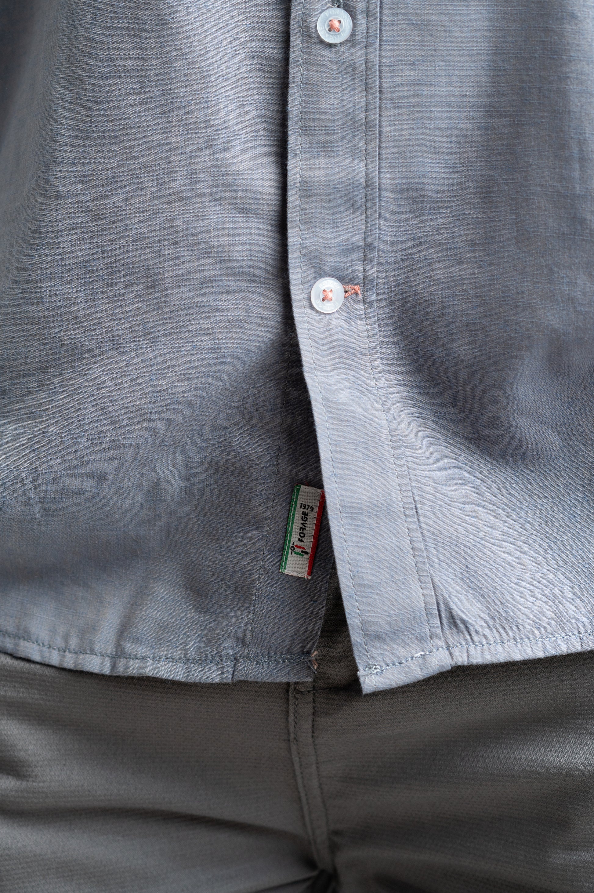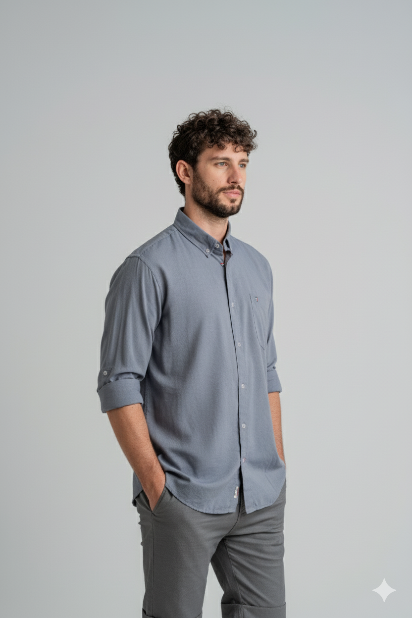 Camisa de algodón ligera y cómoda, en tono gris elegante. Diseño moderno con cuello abotonado, manga larga arremangada y bolsillo discreto. Ideal para combinar en ocasiones casuales o semi-formales con estilo natural.