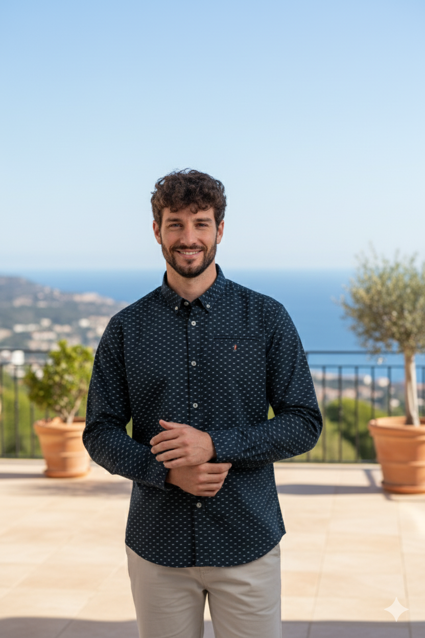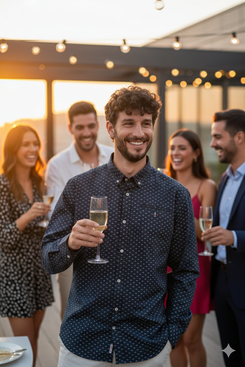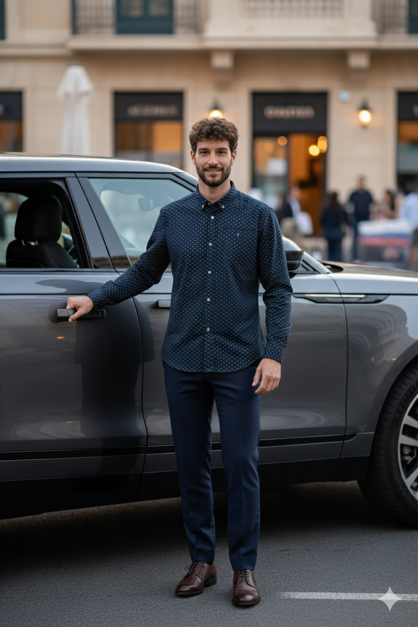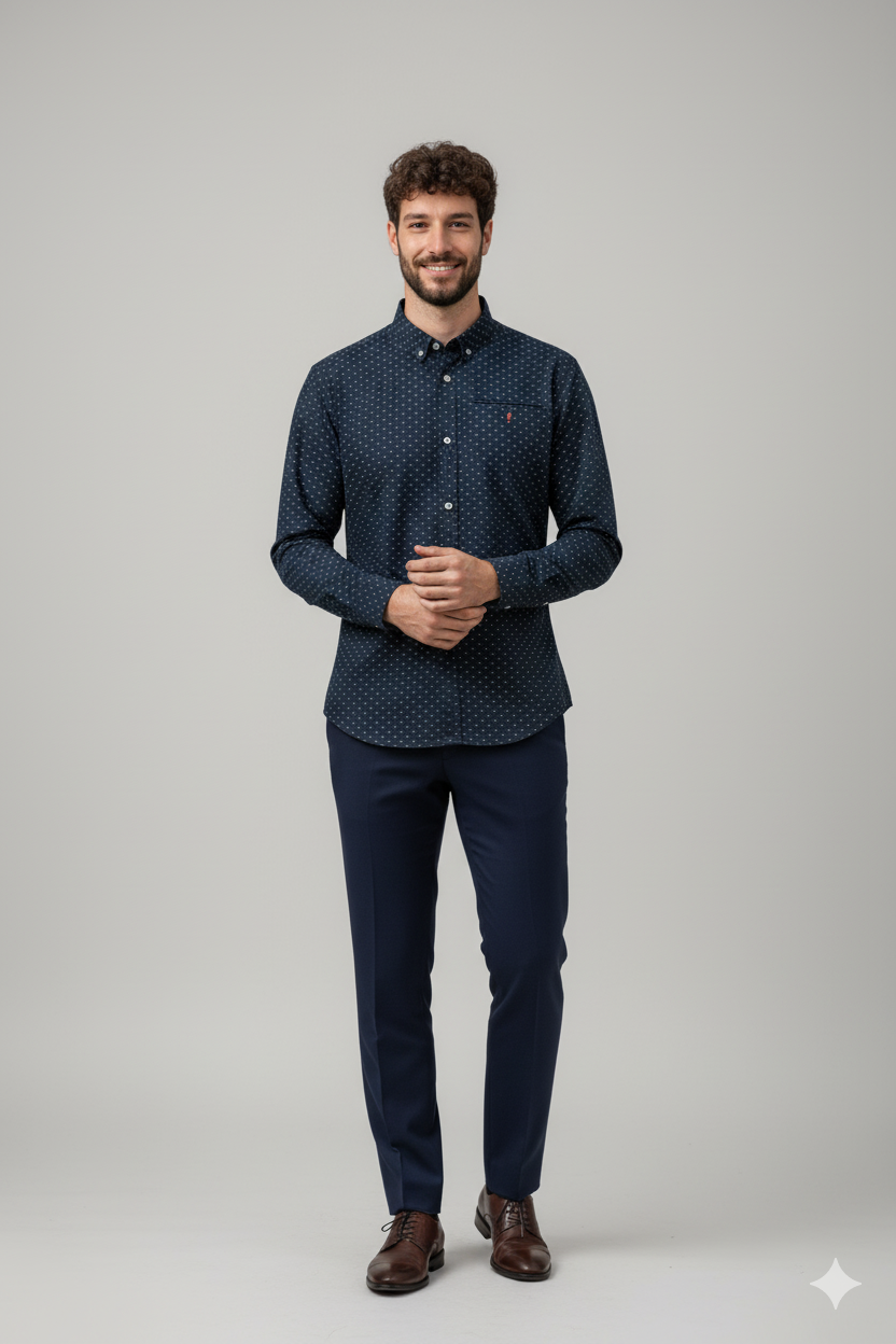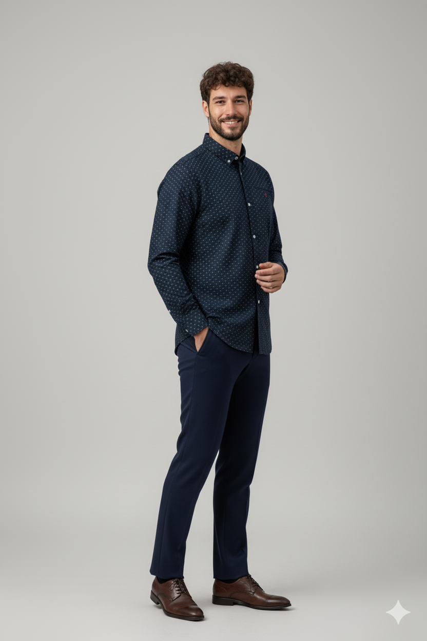Camisa de algodón de manga larga, ligera y transpirable. Su diseño elegante con estampado discreto ofrece versatilidad para ocasiones formales e informales. Ideal para combinar con pantalón clásico o jeans, brindando comodidad diaria.