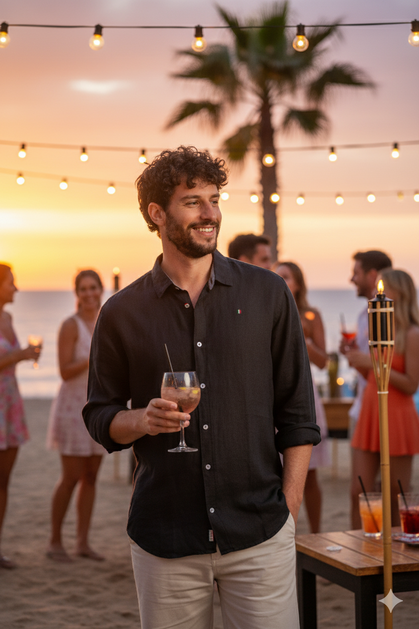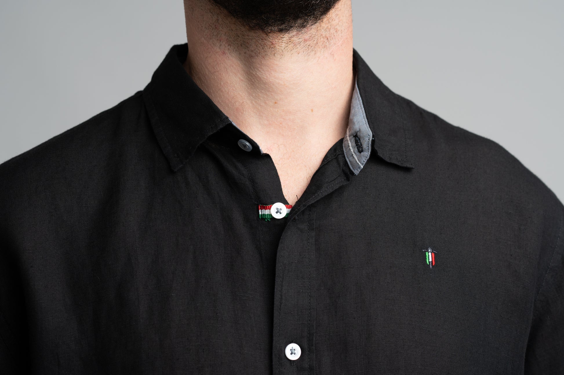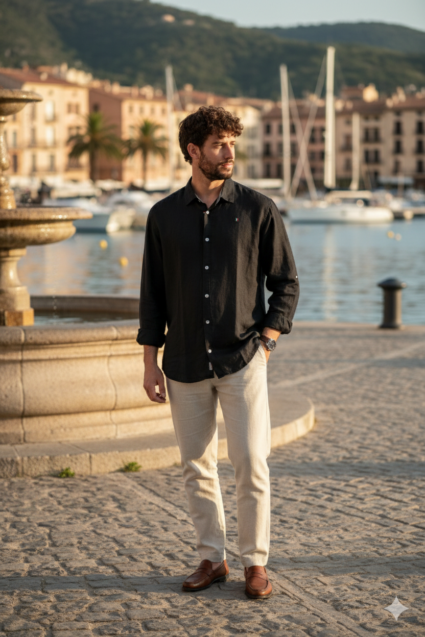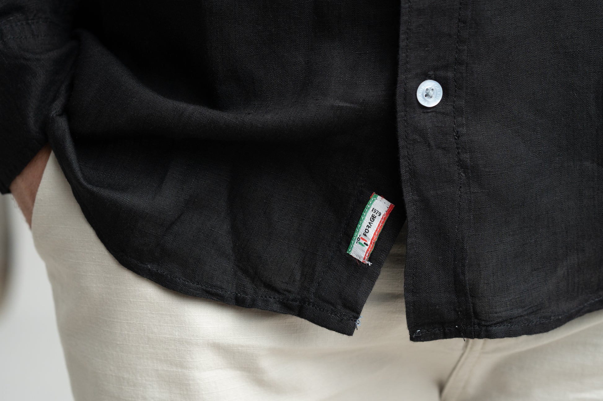 Camisa ligera de algodón en color negro, de manga larga y corte recto. Con botones frontales y cuello clásico, es versátil, elegante y fresca, perfecta para un look sofisticado en ambientes costeros o urbanos.