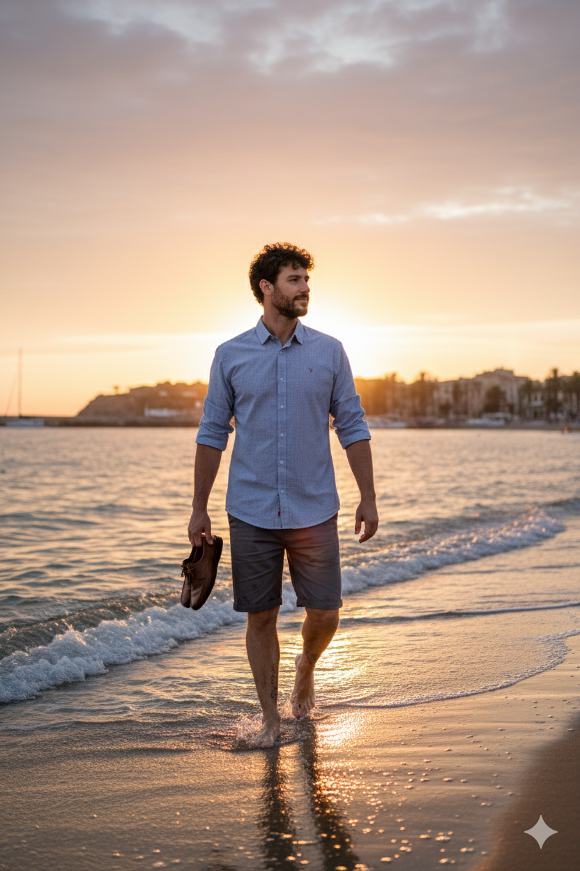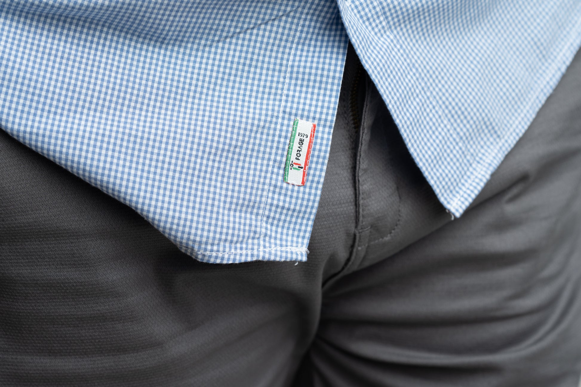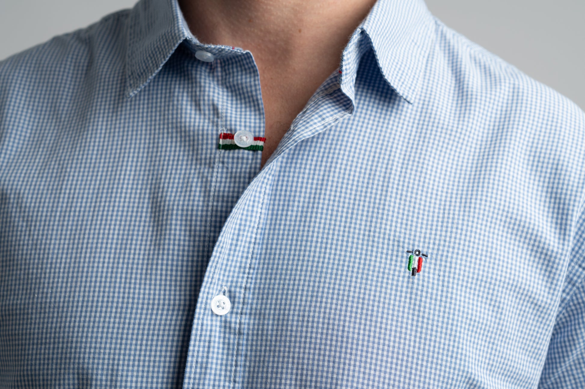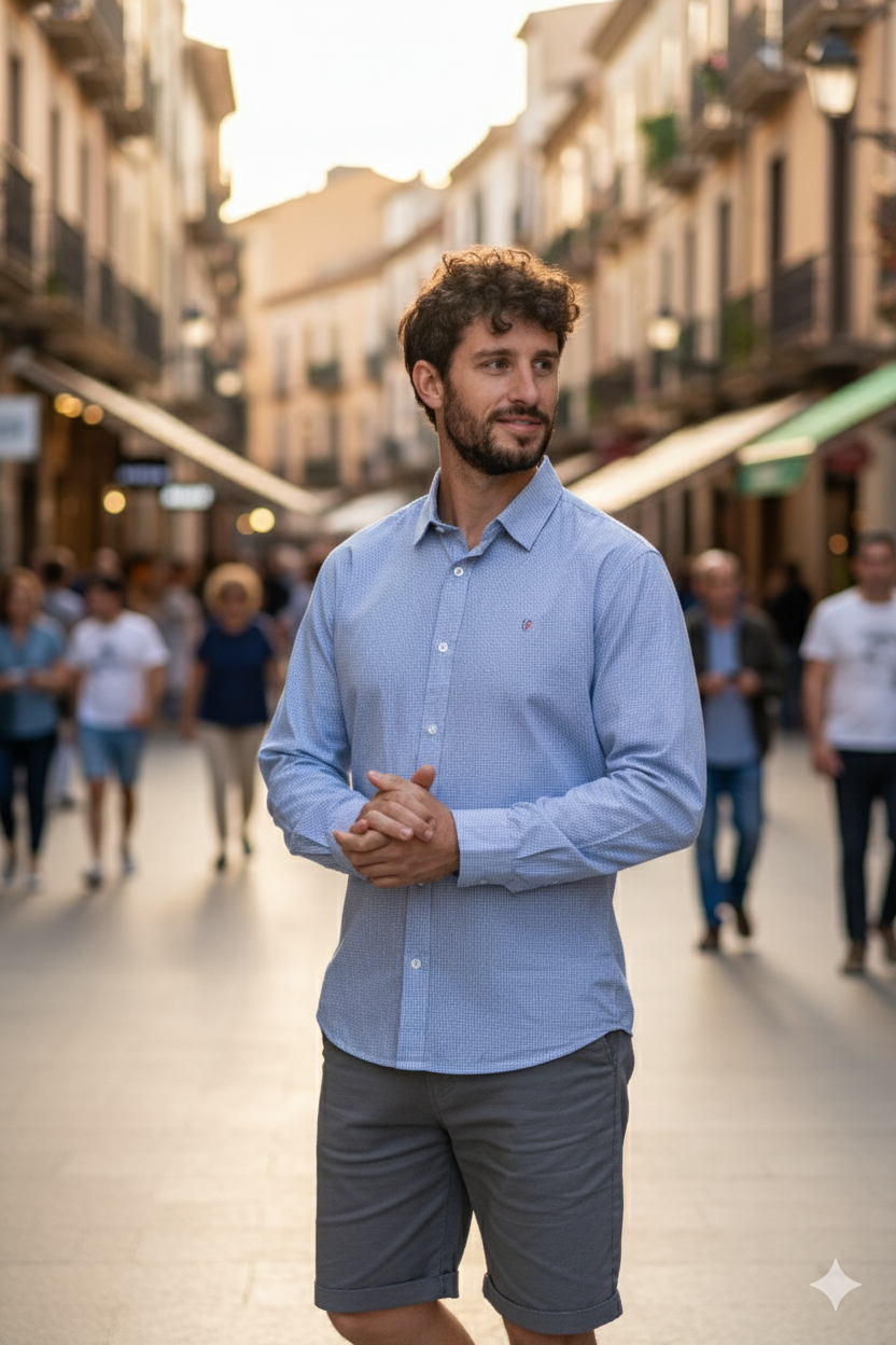 Camisa de algodón azul claro, manga larga, con sutil microcuadro. Corte clásico con cuello camisero, cierre de botones y pequeño bordado en el pecho. Versátil, fresca y cómoda para cualquier ocasión casual o semi-formal.