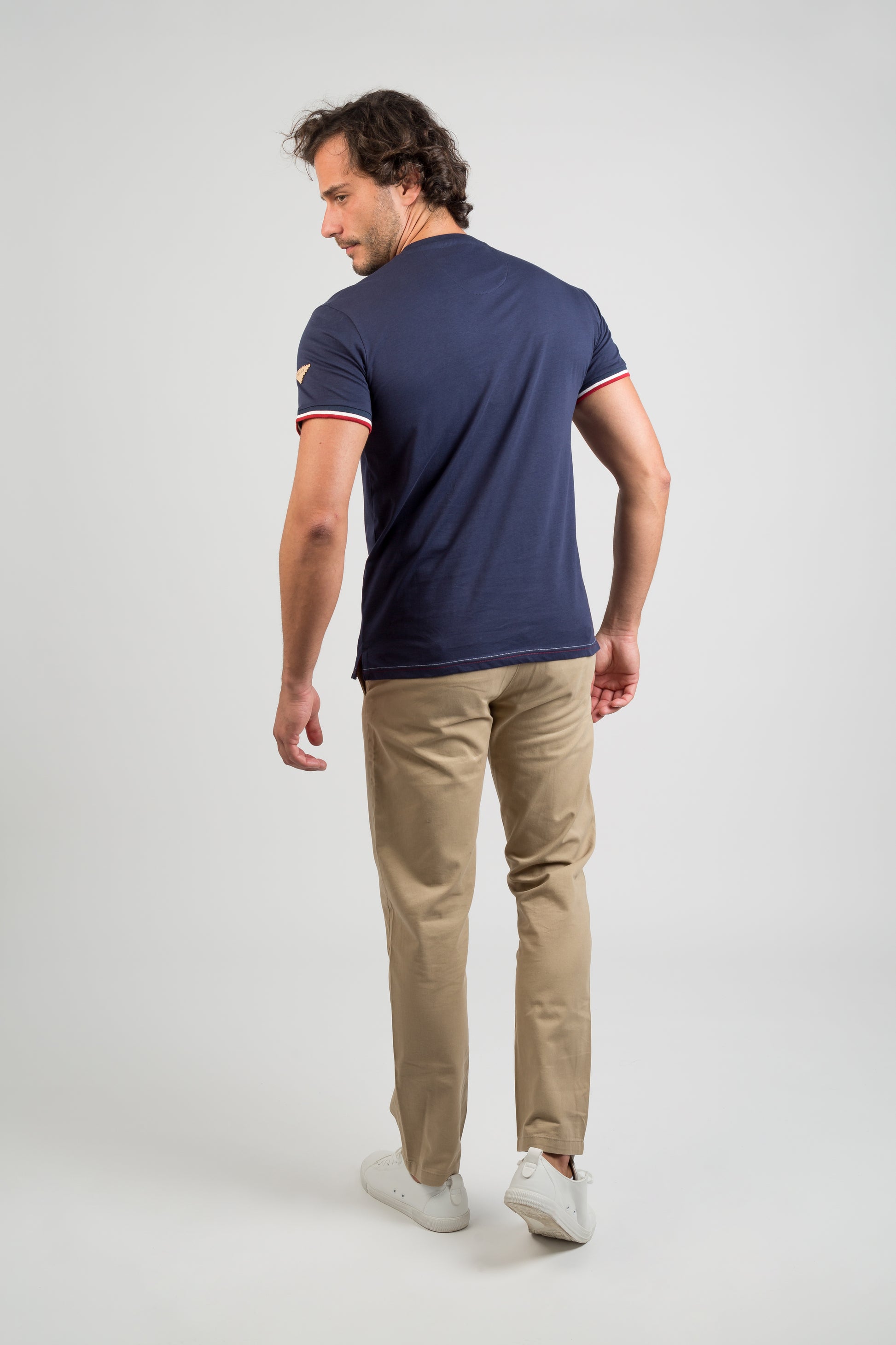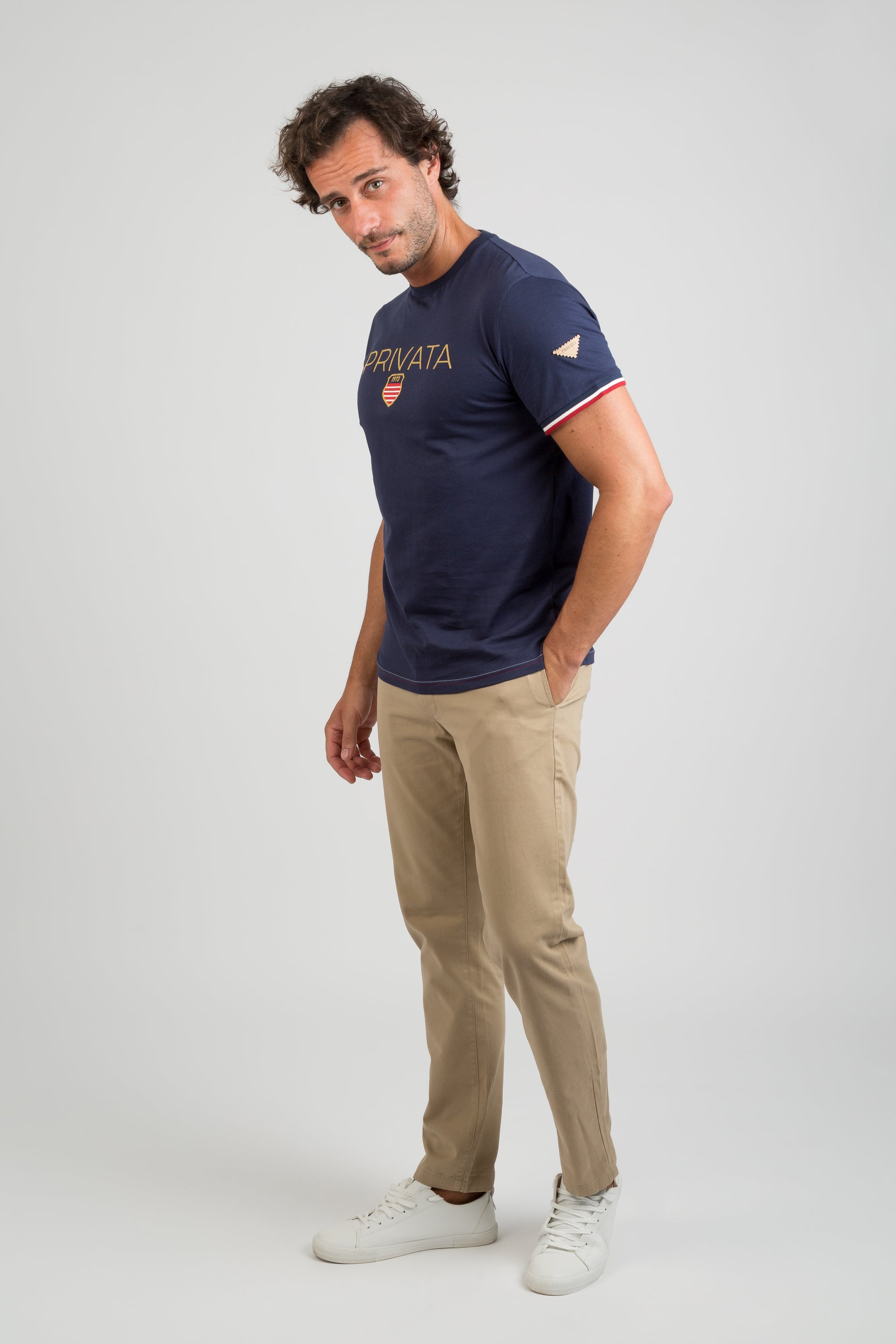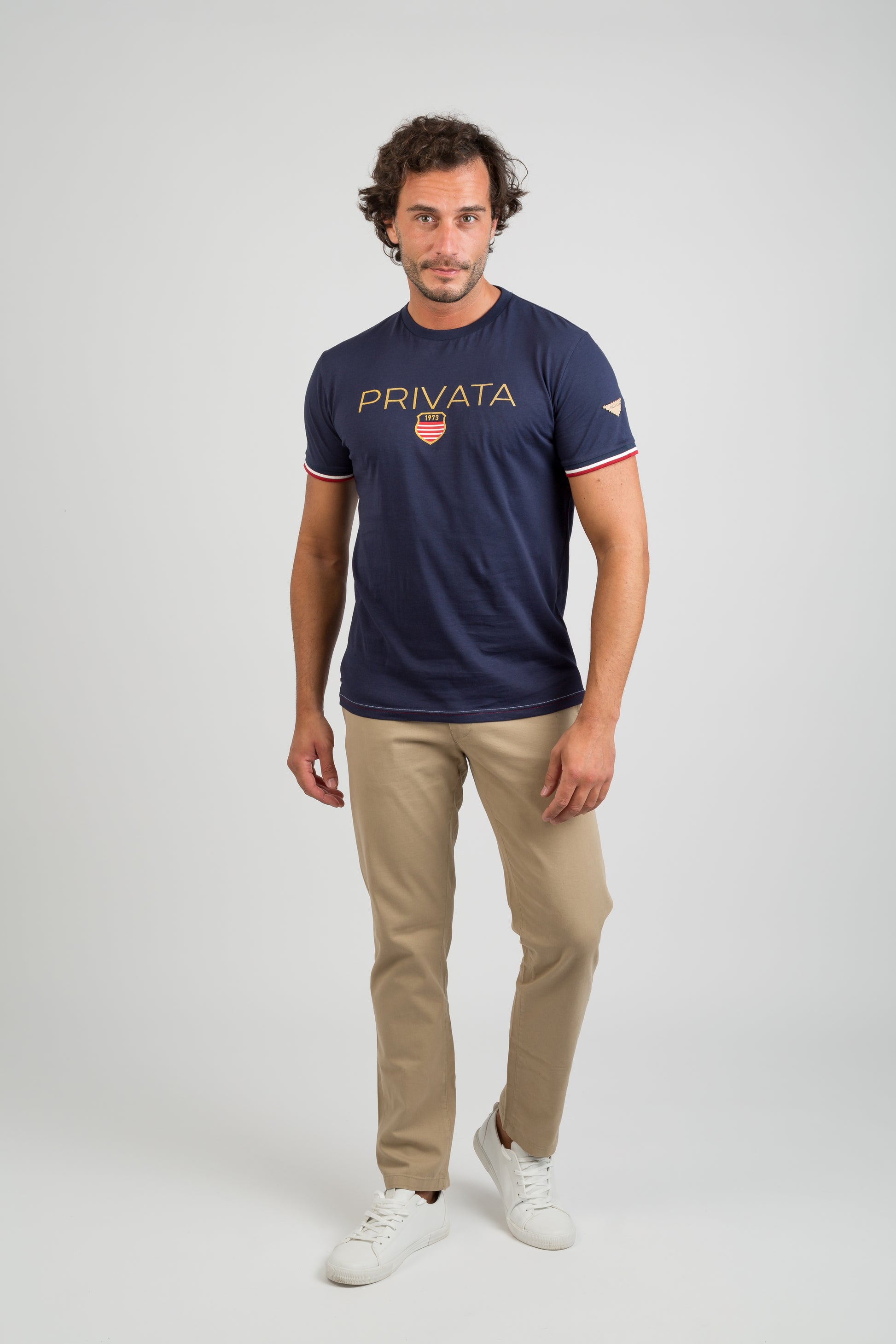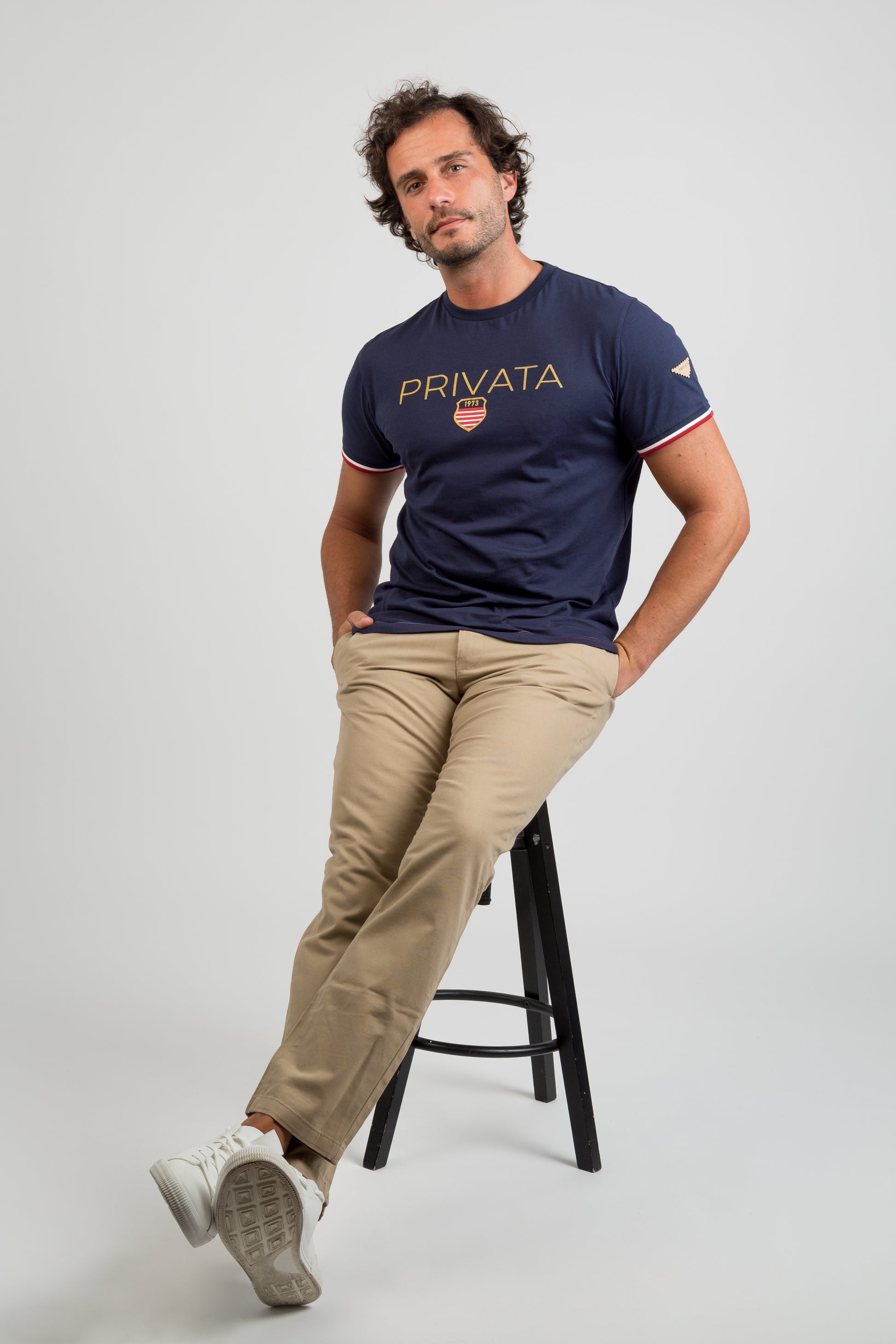 Camiseta de algodón azul marino, manga corta y cuello redondo. Estampado frontal PRIVATA con escudo retro. Detalles en mangas con ribete rojo y blanco. Cómoda, versátil y perfecta para un look casual.