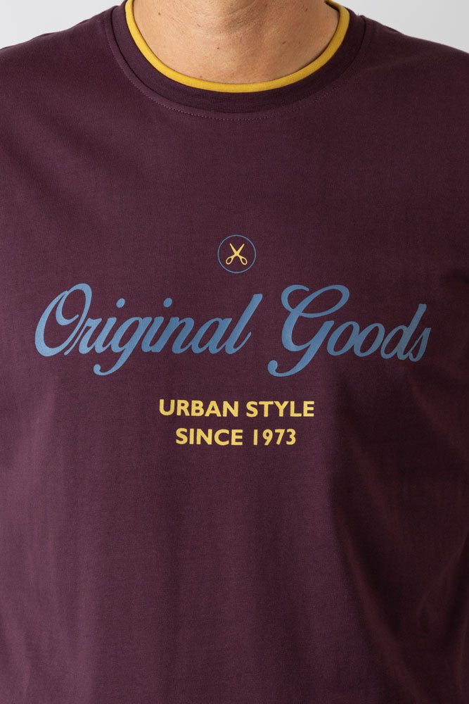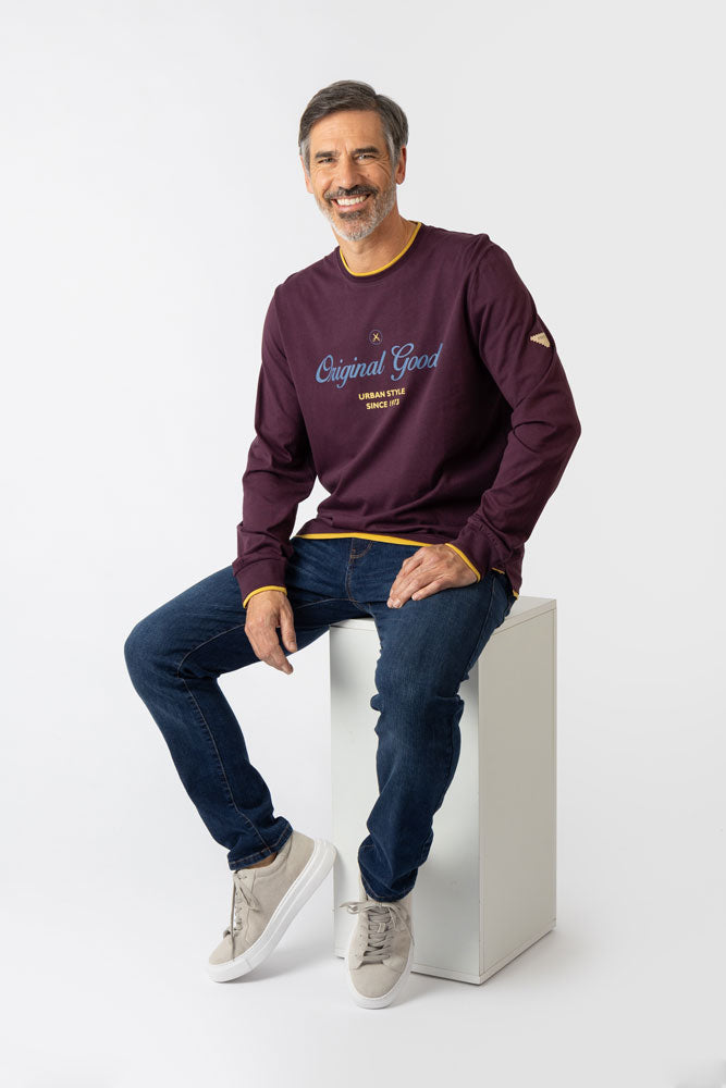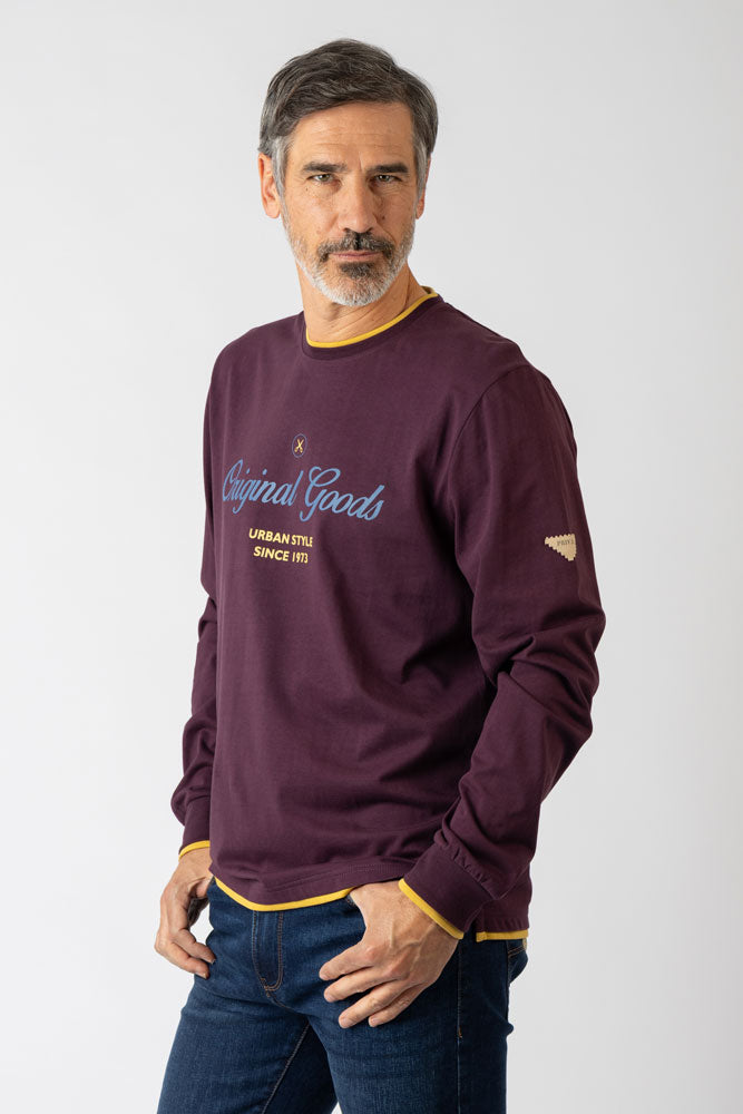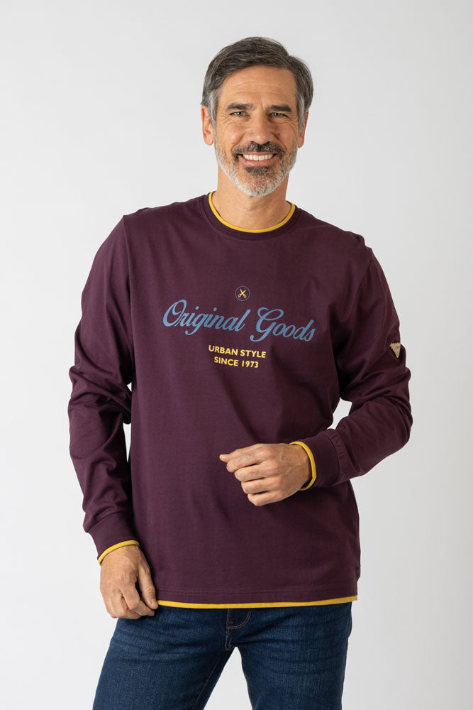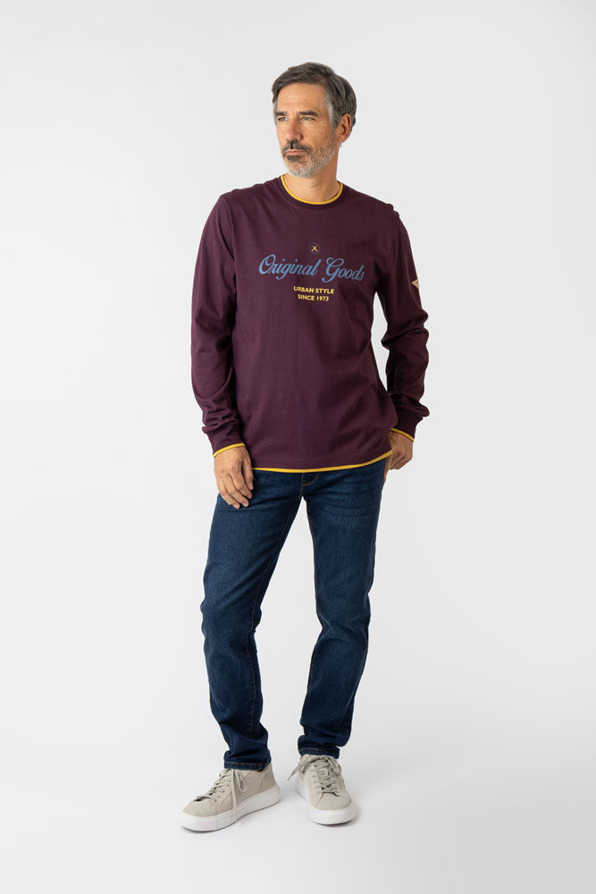 Camiseta de manga larga en algodón suave con estampado Original Goods y detalles en contraste en cuello y puños, disponible en marino, granate y kakhy.