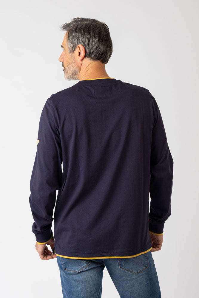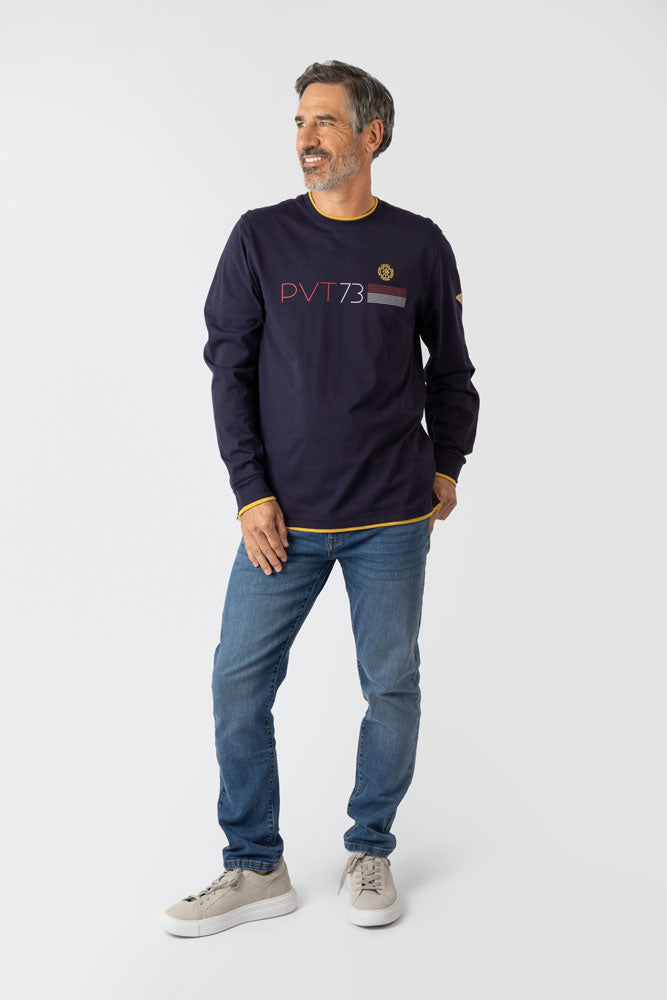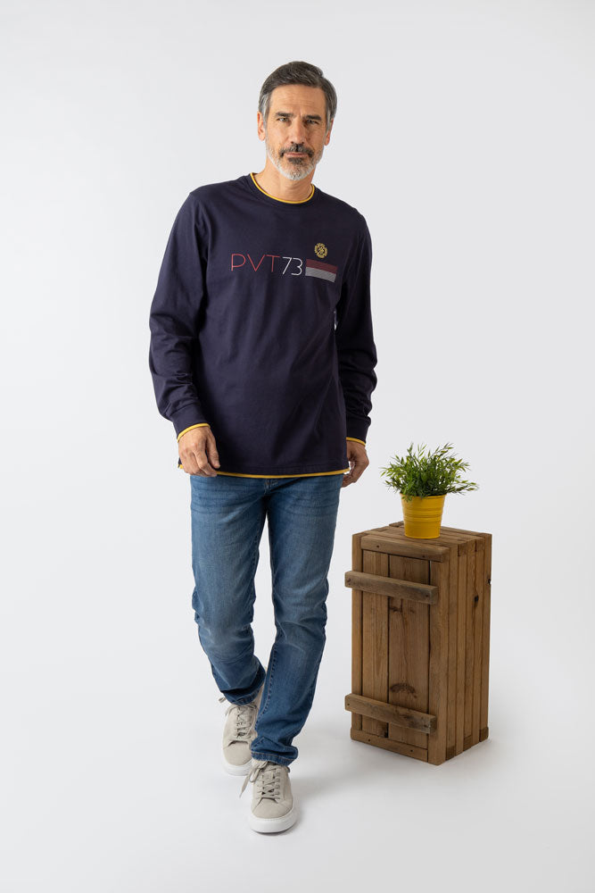 Camiseta de manga larga en color azul marino con estampado frontal “PVT 73” y detalle de líneas en contraste, rematada con vivos amarillos en cuello, puños y bajo. Ideal para un look moderno y deportivo que aporta un toque de estilo único y desenfadado.