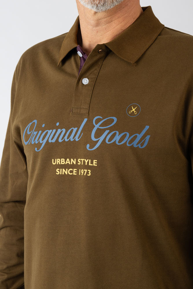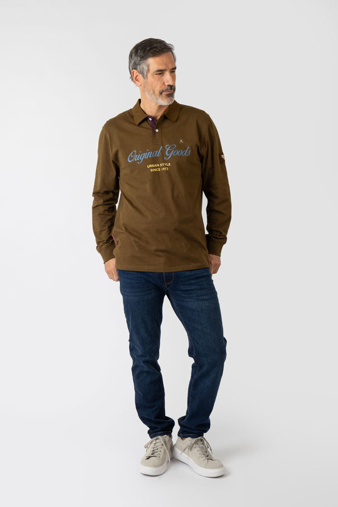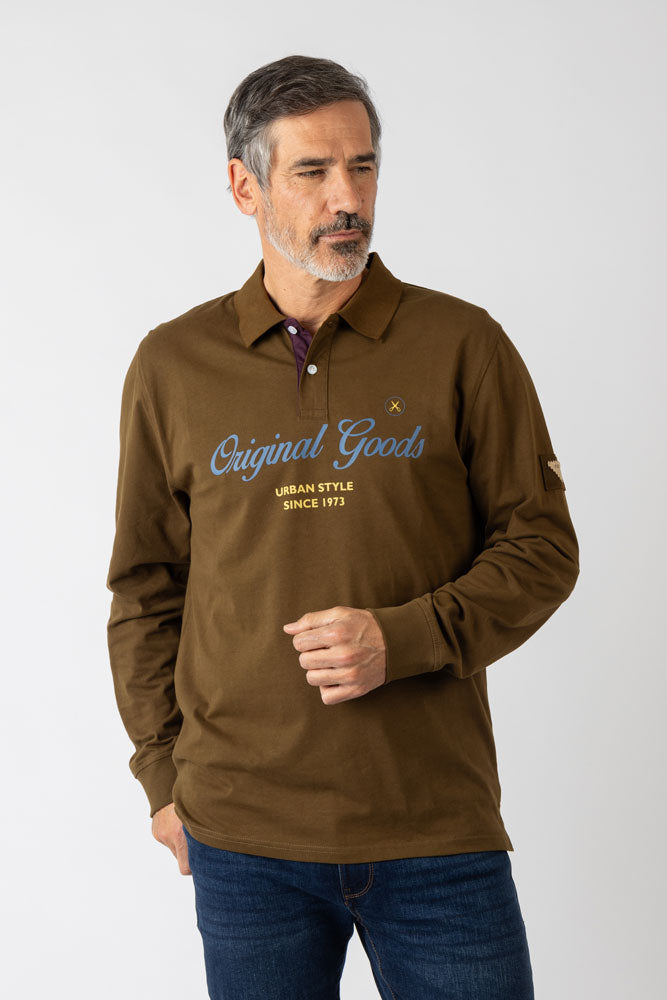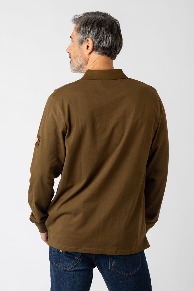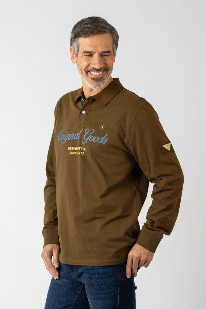 Polo marrón de manga larga con cuello clásico, tapeta de dos botones y estampado frontal en azul y amarillo que aporta un toque distintivo.