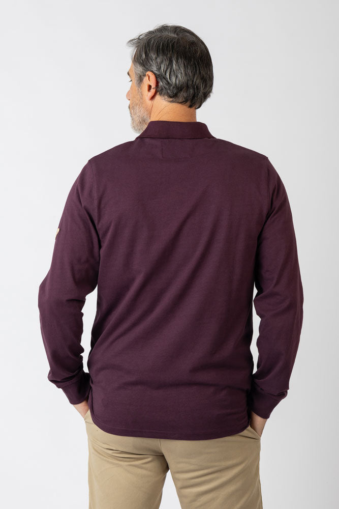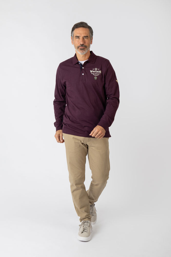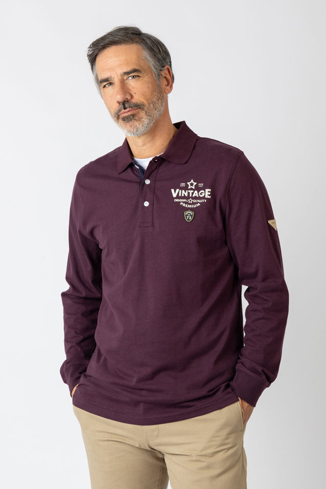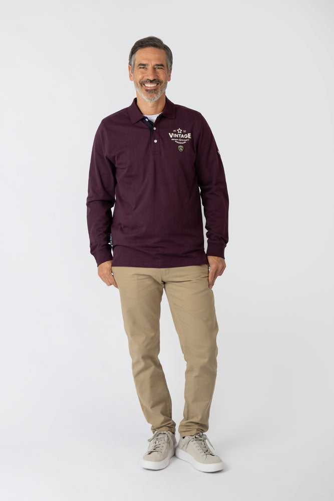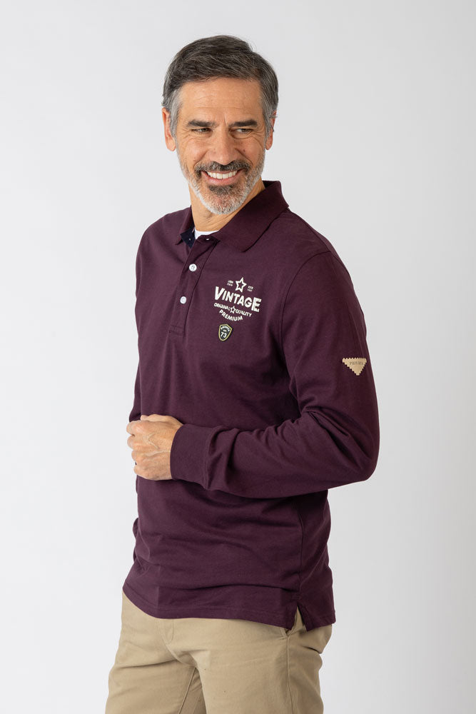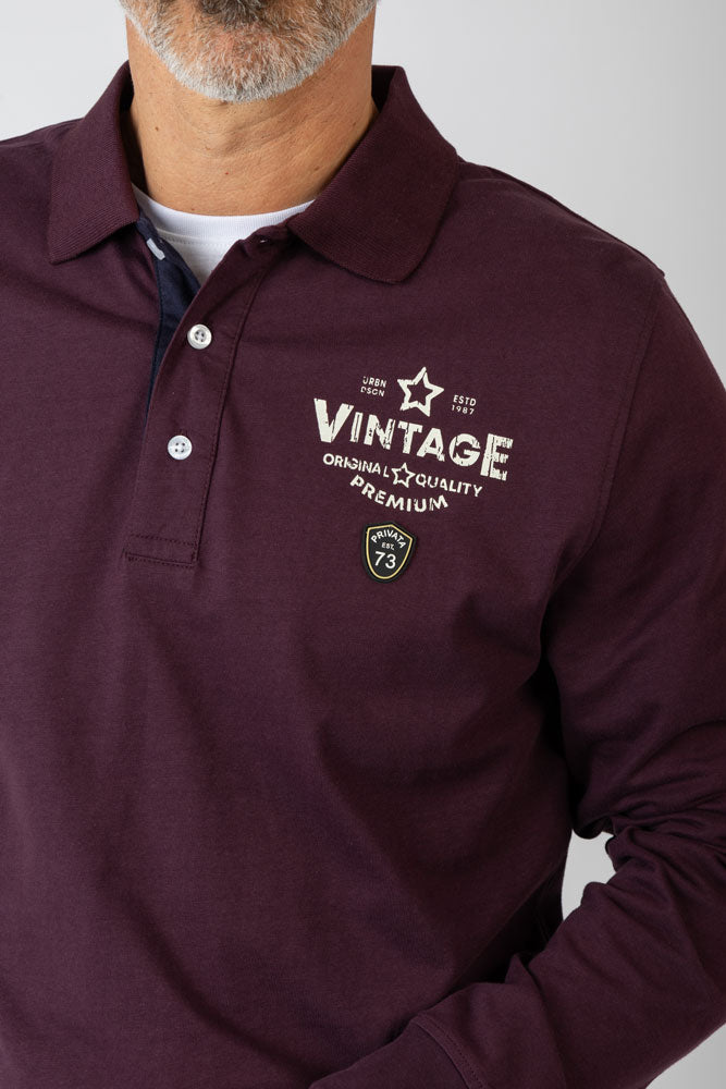 Polo de manga larga color burdeos con estampado vintage y detalles bordados, ideal para un estilo casual y actual.