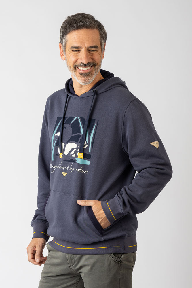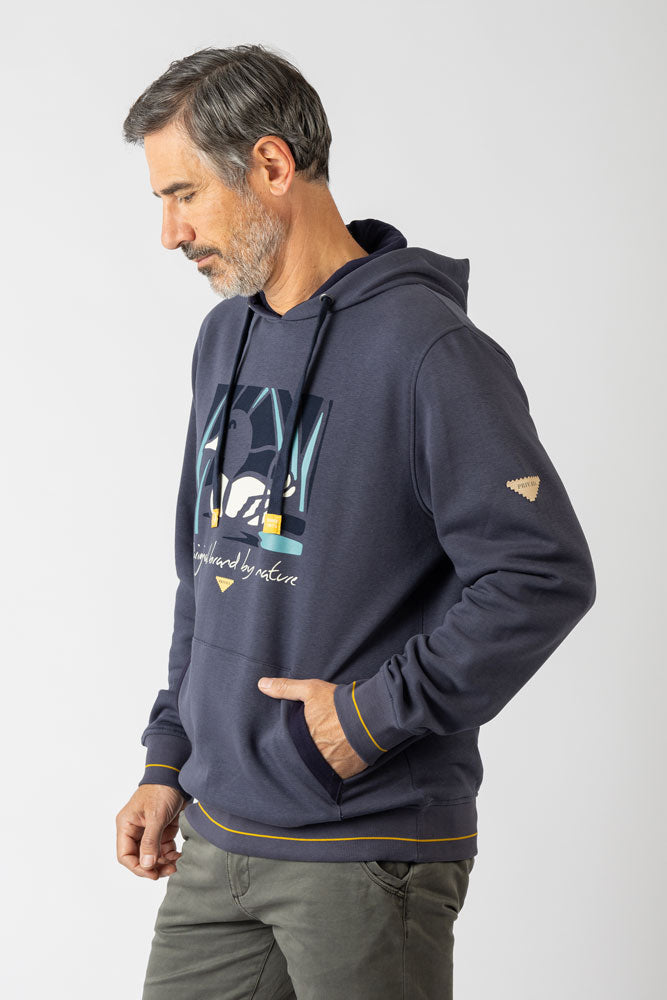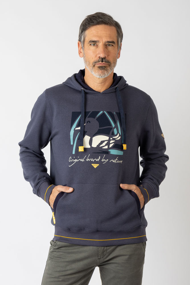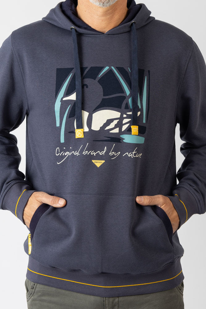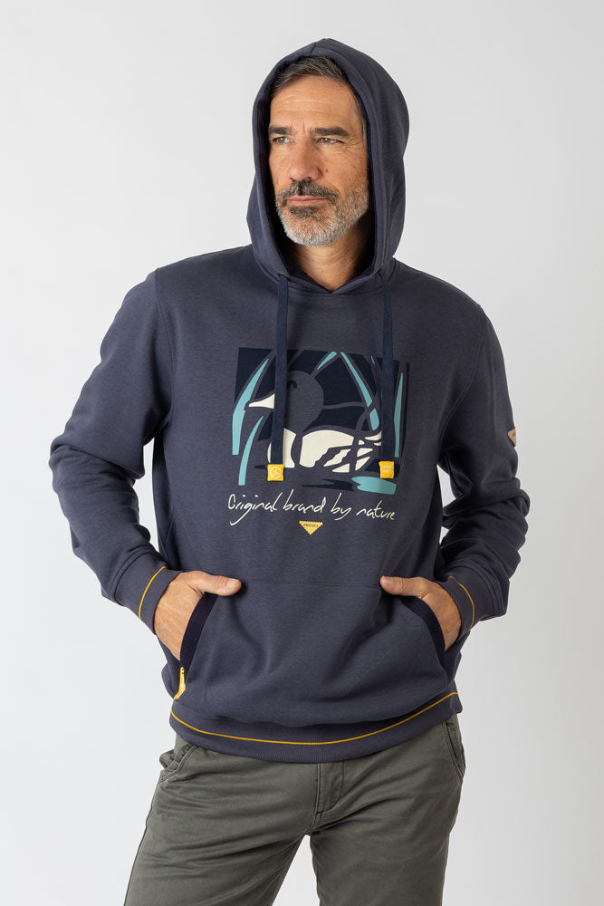 Descubre esta sudadera azul con un estampado artístico de inspiración natural que aporta frescura y originalidad. Los detalles en amarillo realzan un estilo casual perfecto para combinar con jeans o chinos.