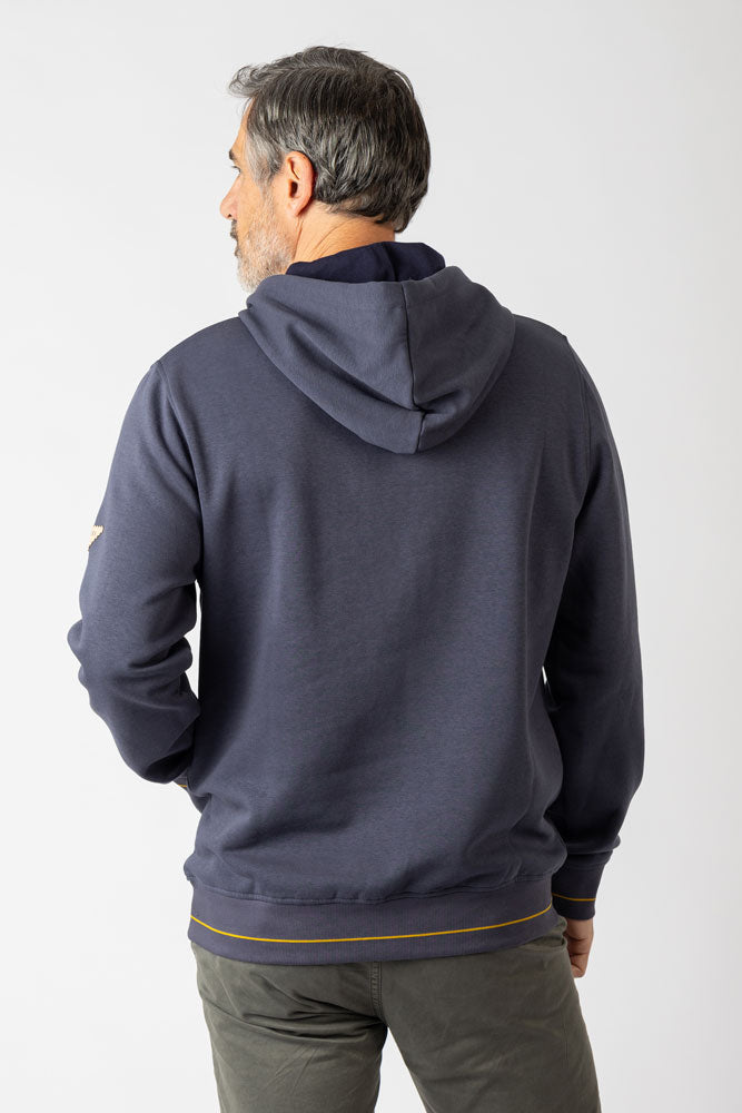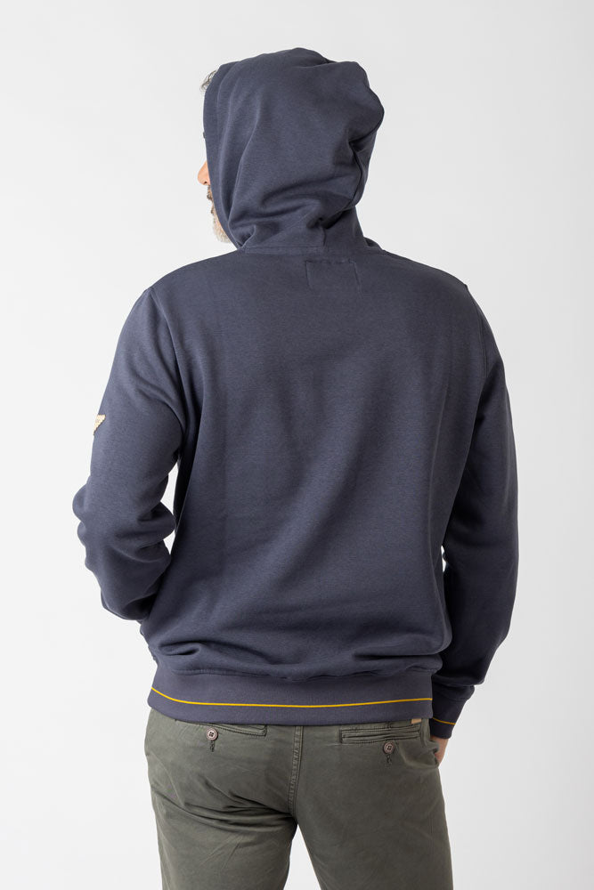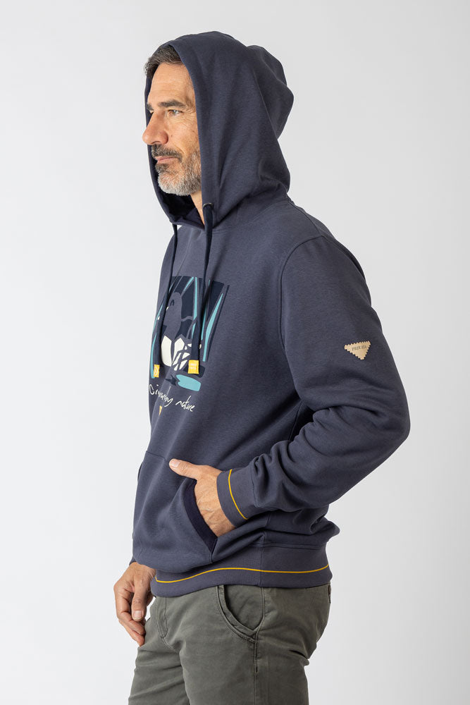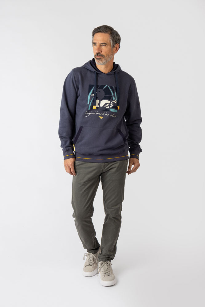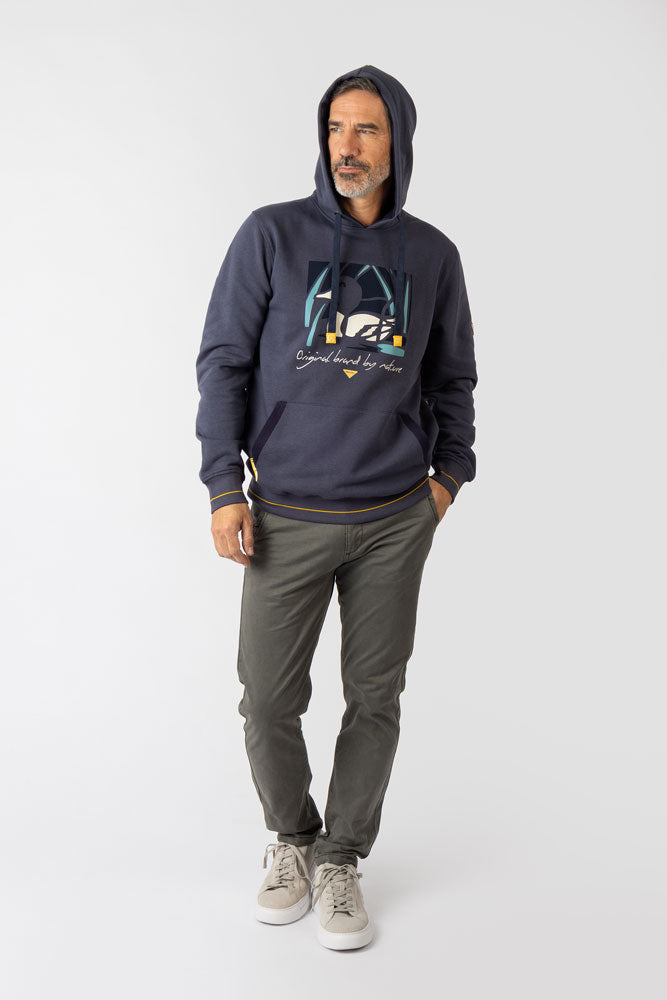 Descubre esta sudadera azul con un estampado artístico de inspiración natural que aporta frescura y originalidad. Los detalles en amarillo realzan un estilo casual perfecto para combinar con jeans o chinos.