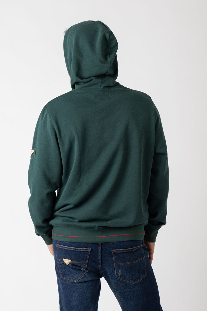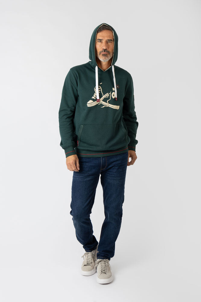Sudadera verde con capucha y estampado frontal de zapatillas, con detalles en contraste en puños y cordones. Un diseño fresco y desenfadado que aporta un toque juvenil y deportivo a tu estilo.