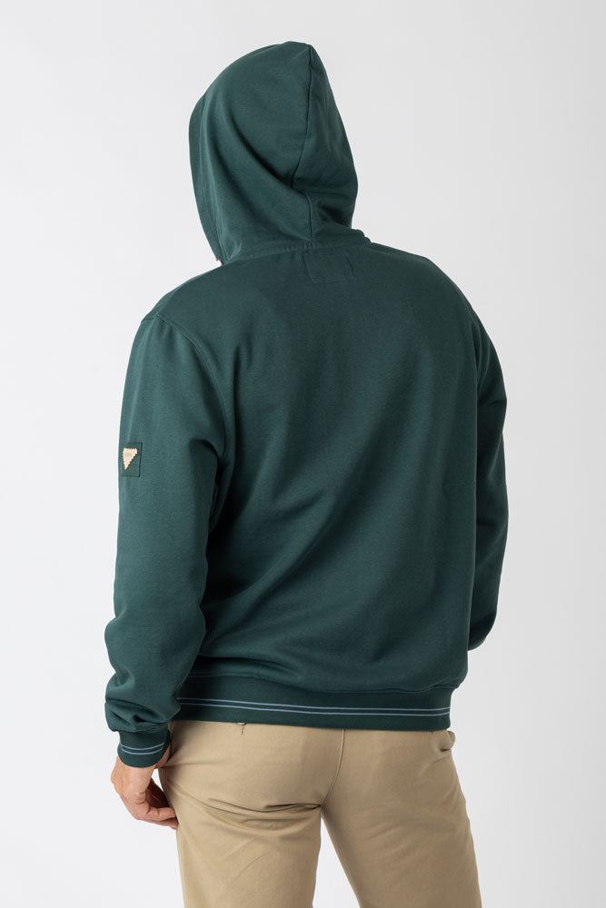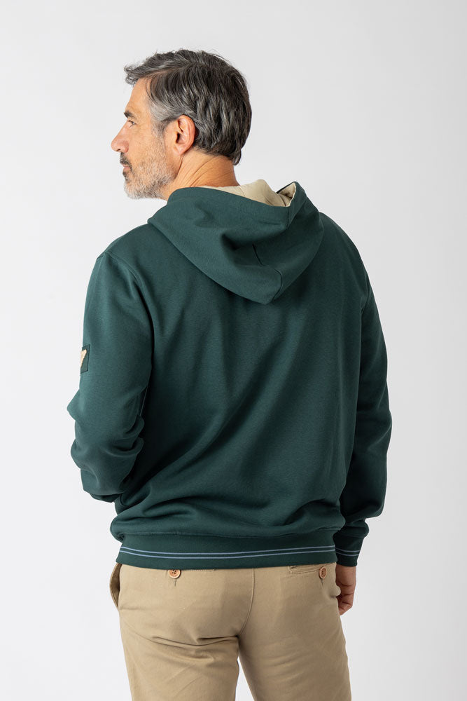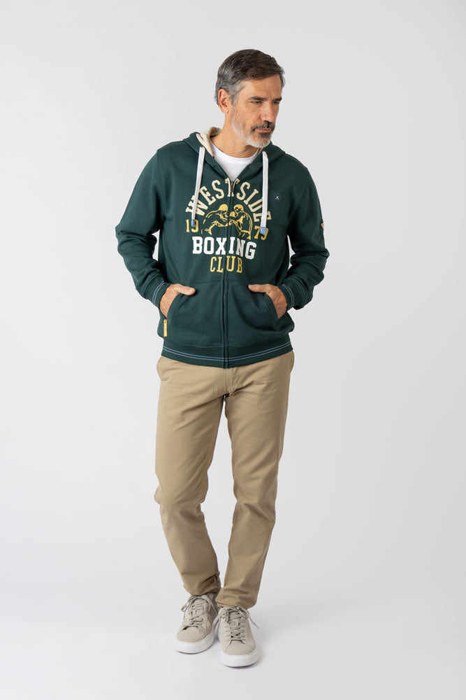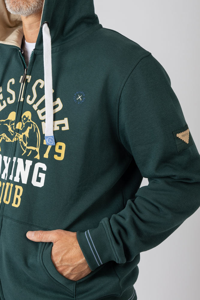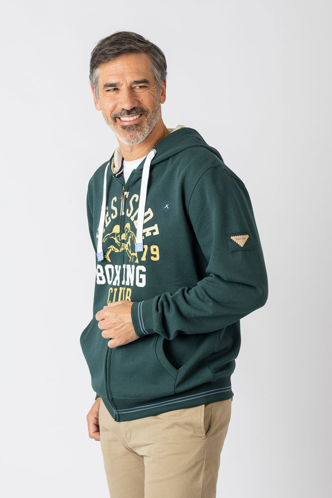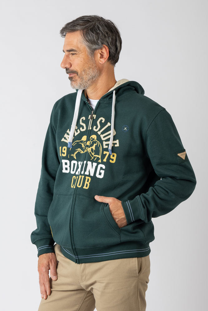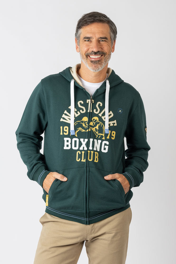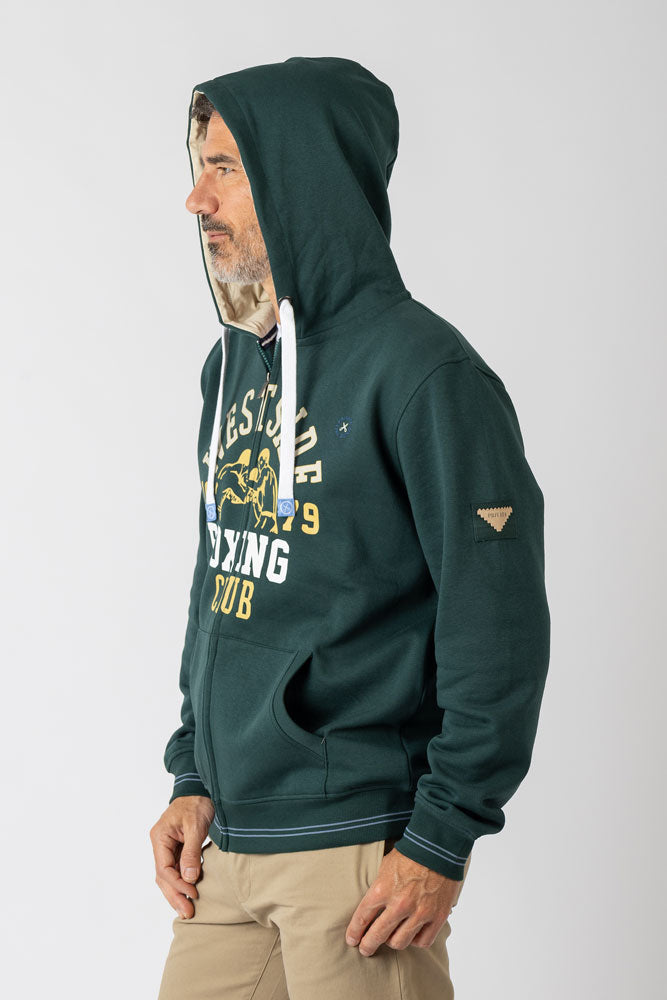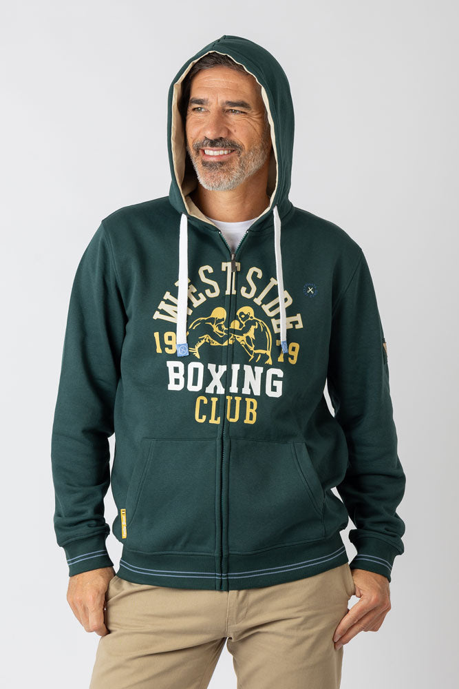 Sudadera con capucha en color verde botella con estampado frontal Westside Boxing Club, cordones contrastados y bolsillos canguro. Ideal para lucir un estilo deportivo con un aire vintage que marca la diferencia.