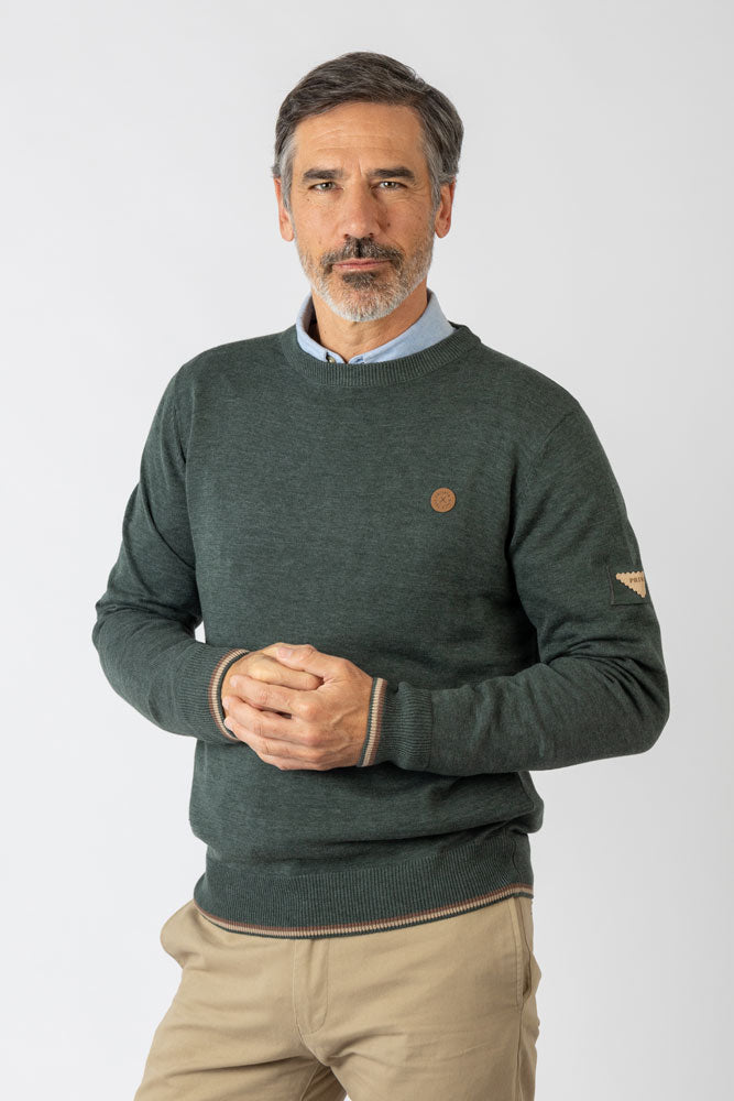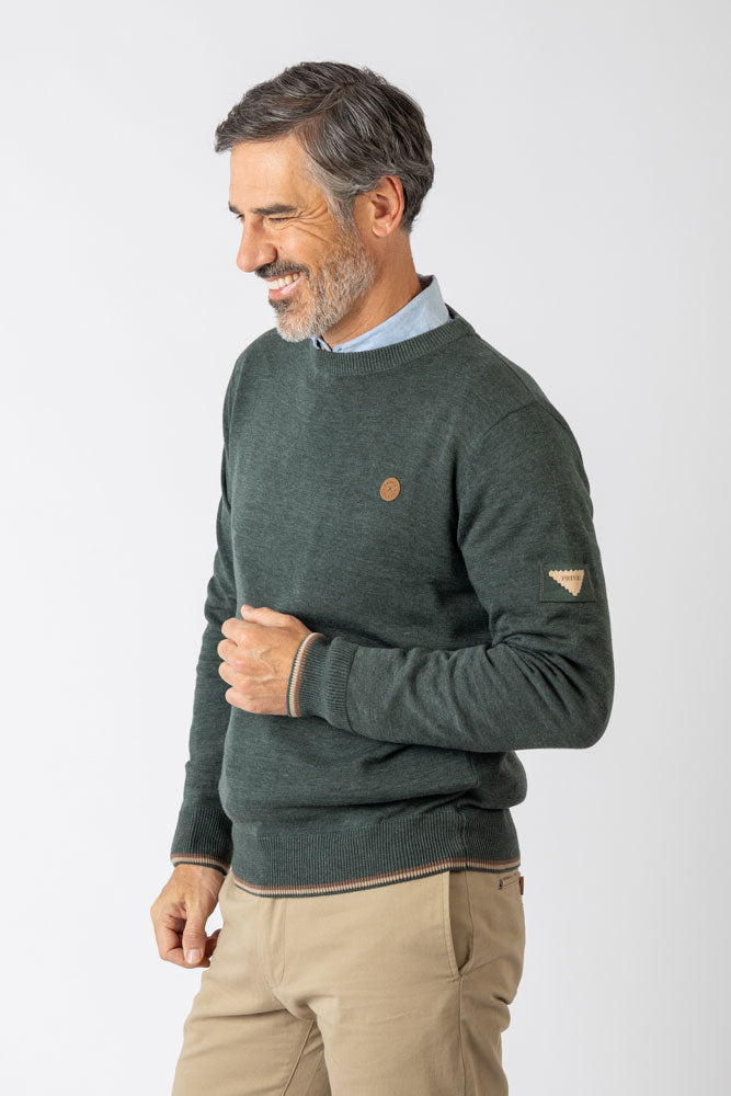 Jersey de punto fino con cuello redondo y detalle distintivo en la manga. Disponible en tres colores (marino, verde y marengo), ideal para un estilo casual con un toque elegante.