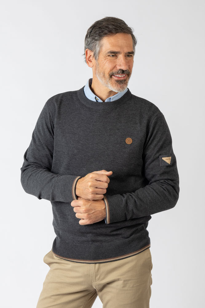 Jersey de punto fino con cuello redondo y detalle distintivo en la manga. Disponible en tres colores (marino, verde y marengo), ideal para un estilo casual con un toque elegante.