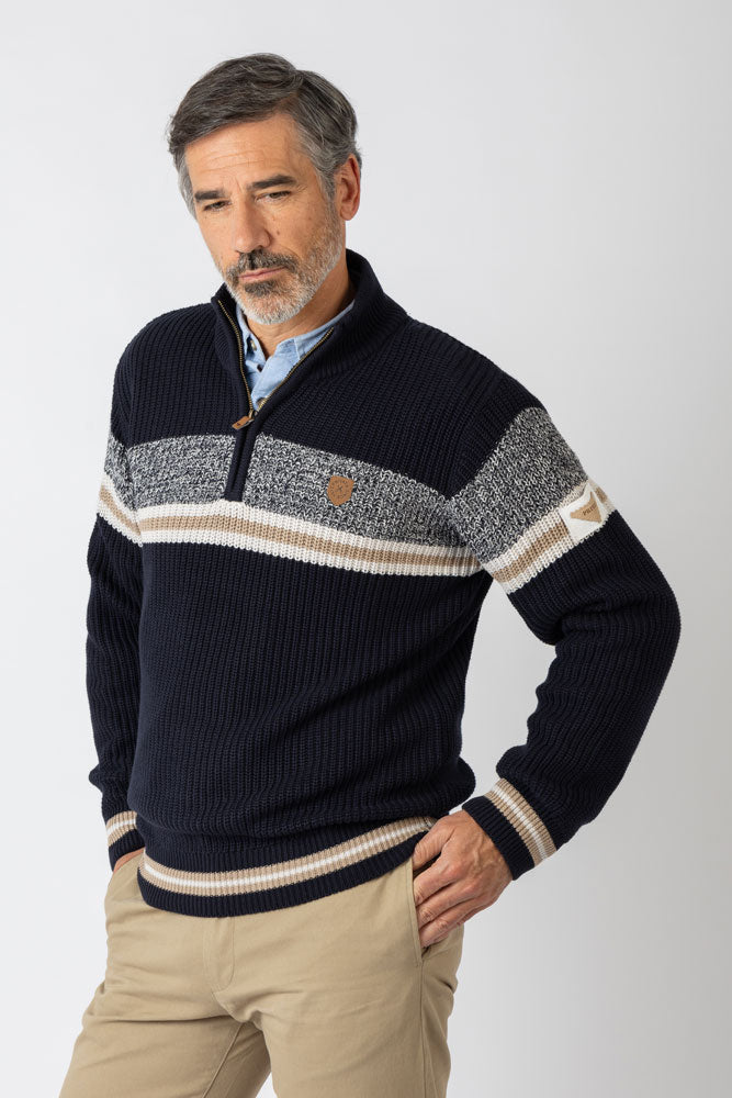 Jersey de punto grueso con cremallera en el cuello y franjas en tonos neutros que contrastan con la base azul marino. Ideal para un look cálido y desenfadado en los días fríos.