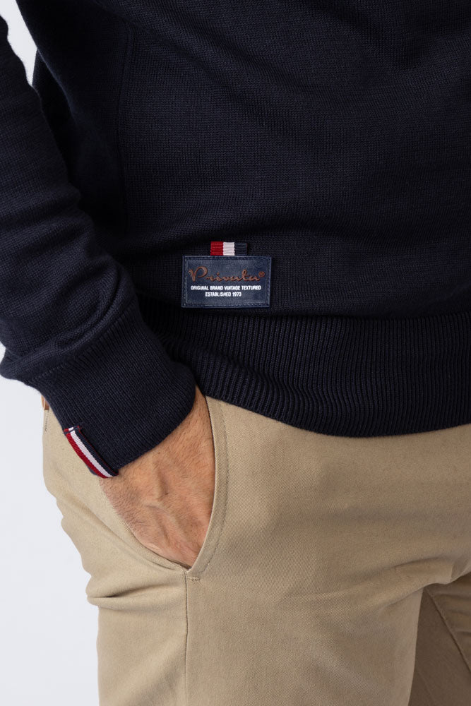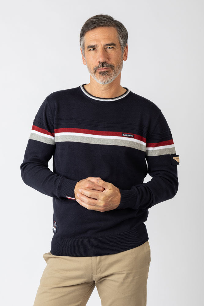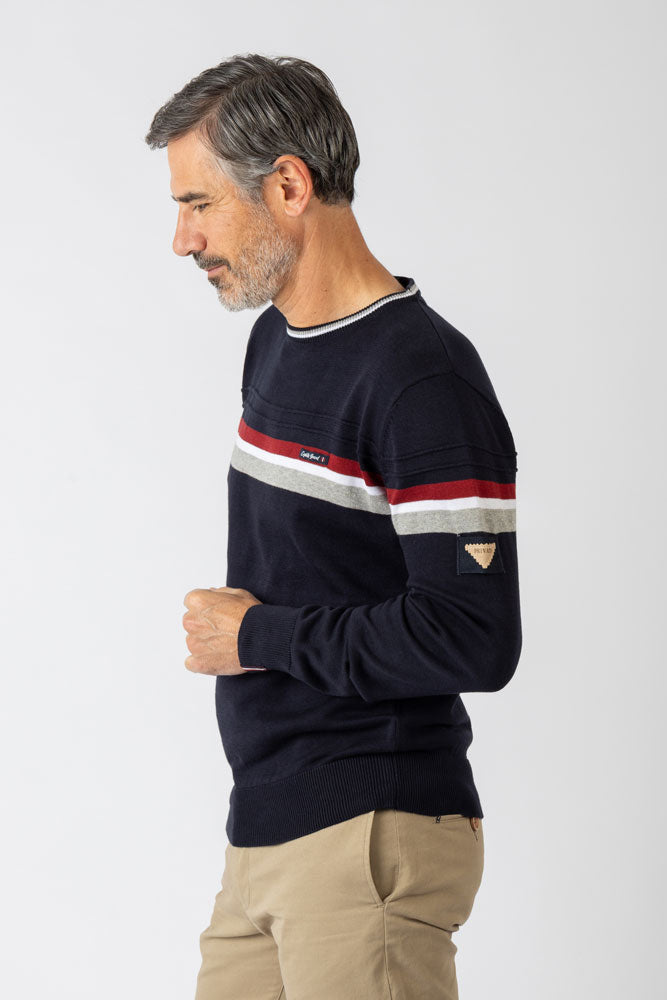 Jersey de punto con cuello redondo y diseño listado en el pecho que combina franjas en contraste. Perfecto para un look casual con un toque actual.